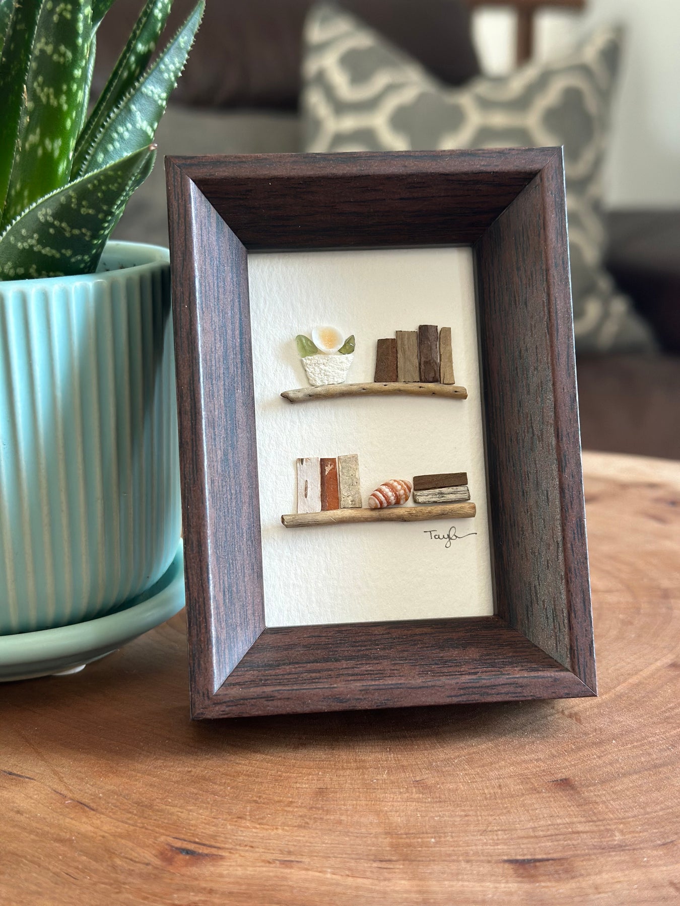 Bookshelf Art - This miniature artwork captures the quiet comfort of a well loved bookshelf in an unexpected way. Set inside of a rich walnut mini wood frame, two delicate driftwood shelves rest against a soft, neutral background. Upon them sit tiny "books" crafted from driftwood, small plants made of shells and sea glass adding a gentle touch of life. This art envokes the peaceful atmosphere of a quiet reading nook by the sea, where stories and nature exixt side by side. Perfect for book lovers.