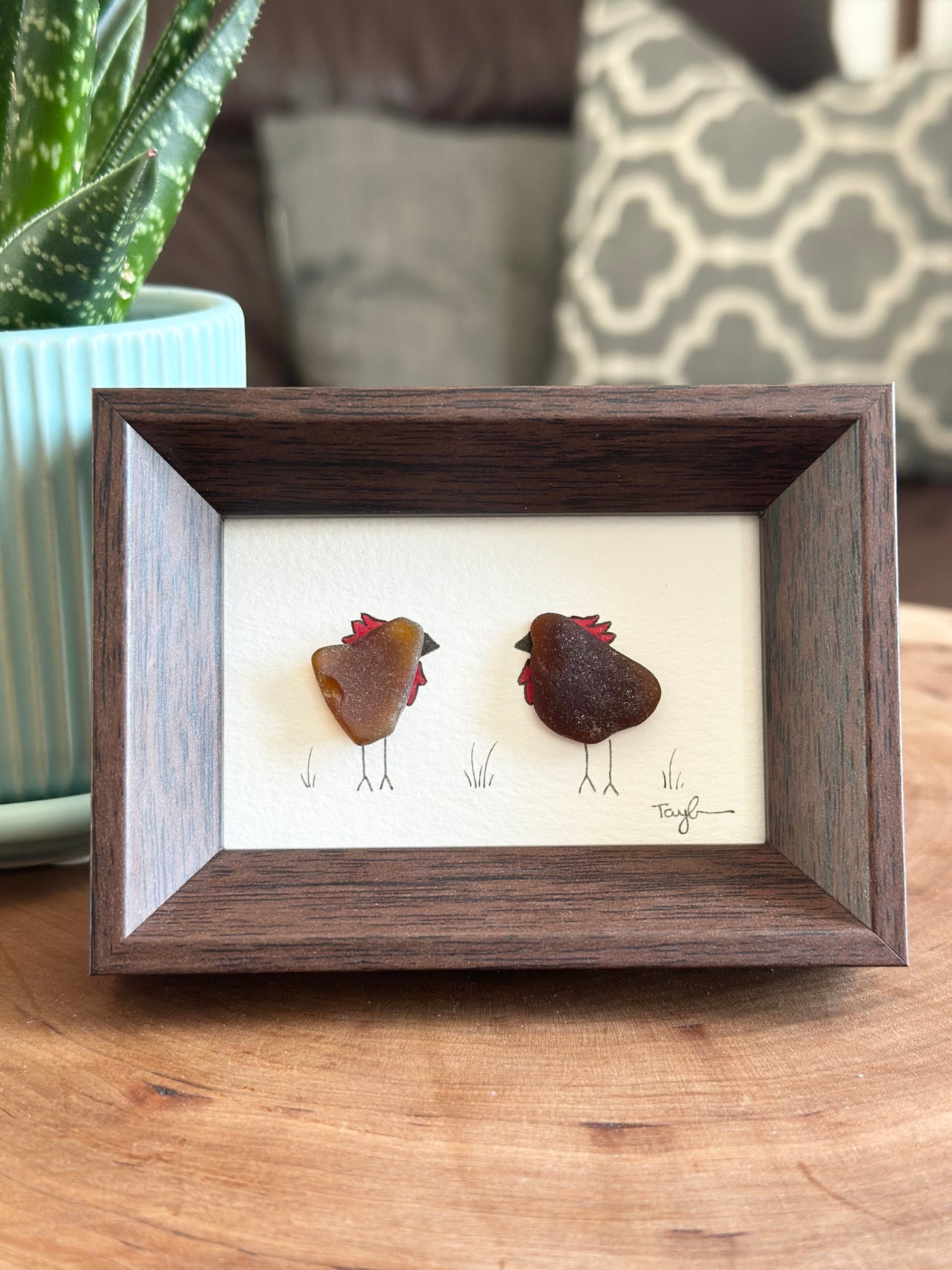 Sea Glass Chicken Art - This art captures a day at the farm with two pieces of naturally ocean tumbled brown sea glass thoughtfully arranged to create and adorable pair of rustic hens. Each with hand drawn details that bring them to life. Set against a neutral backgrown and framed in a rich walnut mini wood frame. This piece blends perfectly with farmhouse, cottage, coastal, or coountry-inspired decor.