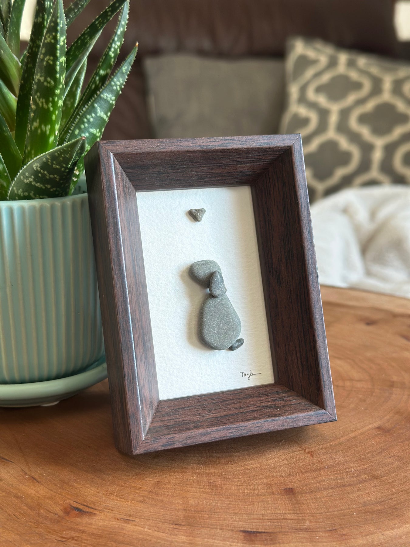 Puppy Love Pebble Art - This adoriable Puppy Pebble Art features a minimalist puppy crafted from smooth and naturally shaped pebbles. Carefully arranged within a rich walnut mini wood frame. The pebbles form a sweet sitting pup, and a small stone heart floating just above adding a touch of warmth and affection to this art piece. This piece captures personality and love through the beauty of nature's smallest details. Perfect for dog lovers!