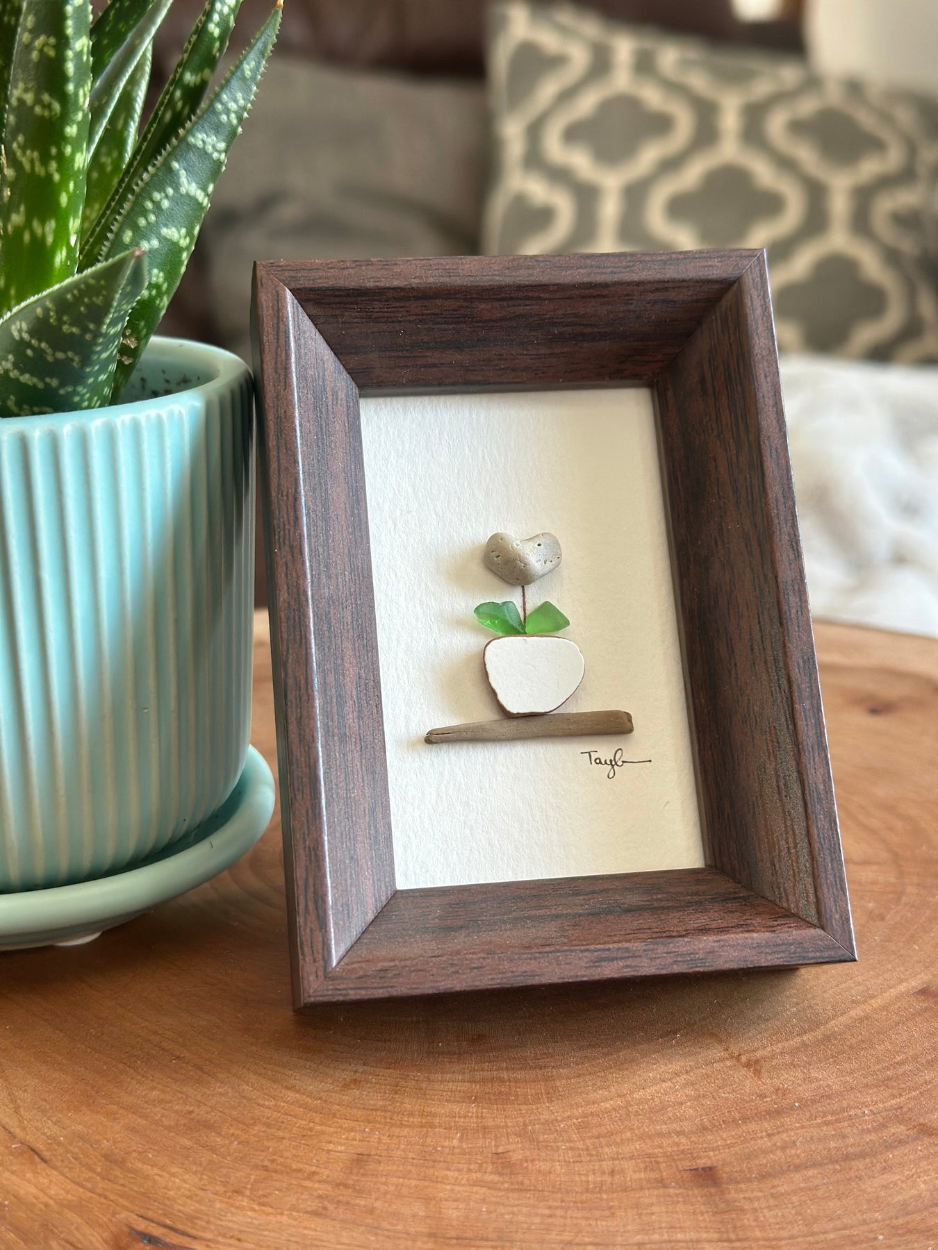 Heart In Bloom Pebble Art - This charming handcrafted Pebble Art piece captures the beauty of simple moments and growing love. A smooth heart shaped stone gently floats above delicate sea glass leaves sprouting from a white piece of tumbbled pottery carefully arranged on natural driftwood. Set against a soft neutral background and framed in a rich walnut mini wood frame, this minimalist design brings warmth and calm to any space.