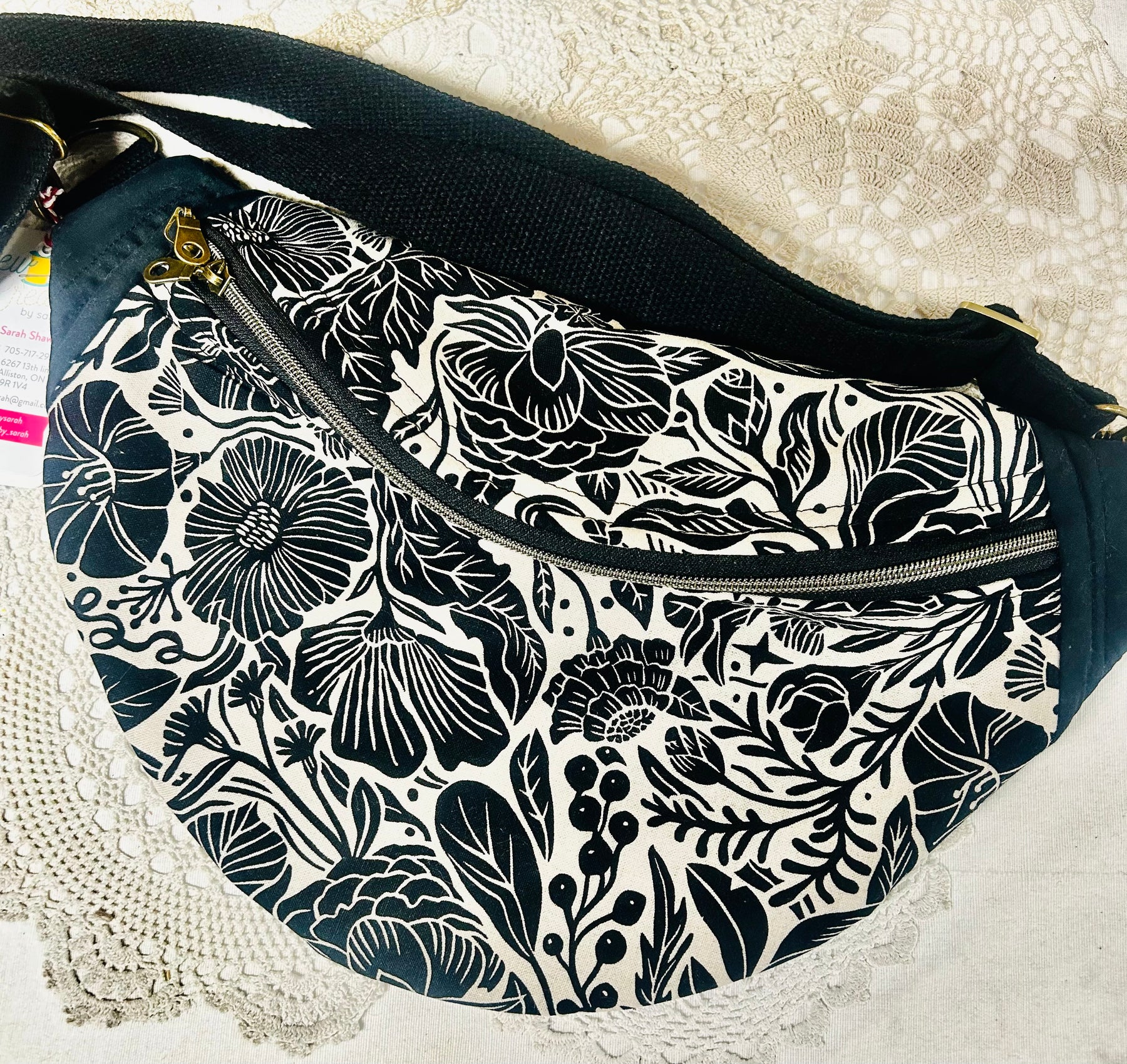 Quilted zippered bag using a fun array of top quality fabrics, hardware and adjustable strap. Handsfree, lightweight and fantastic for traveling.