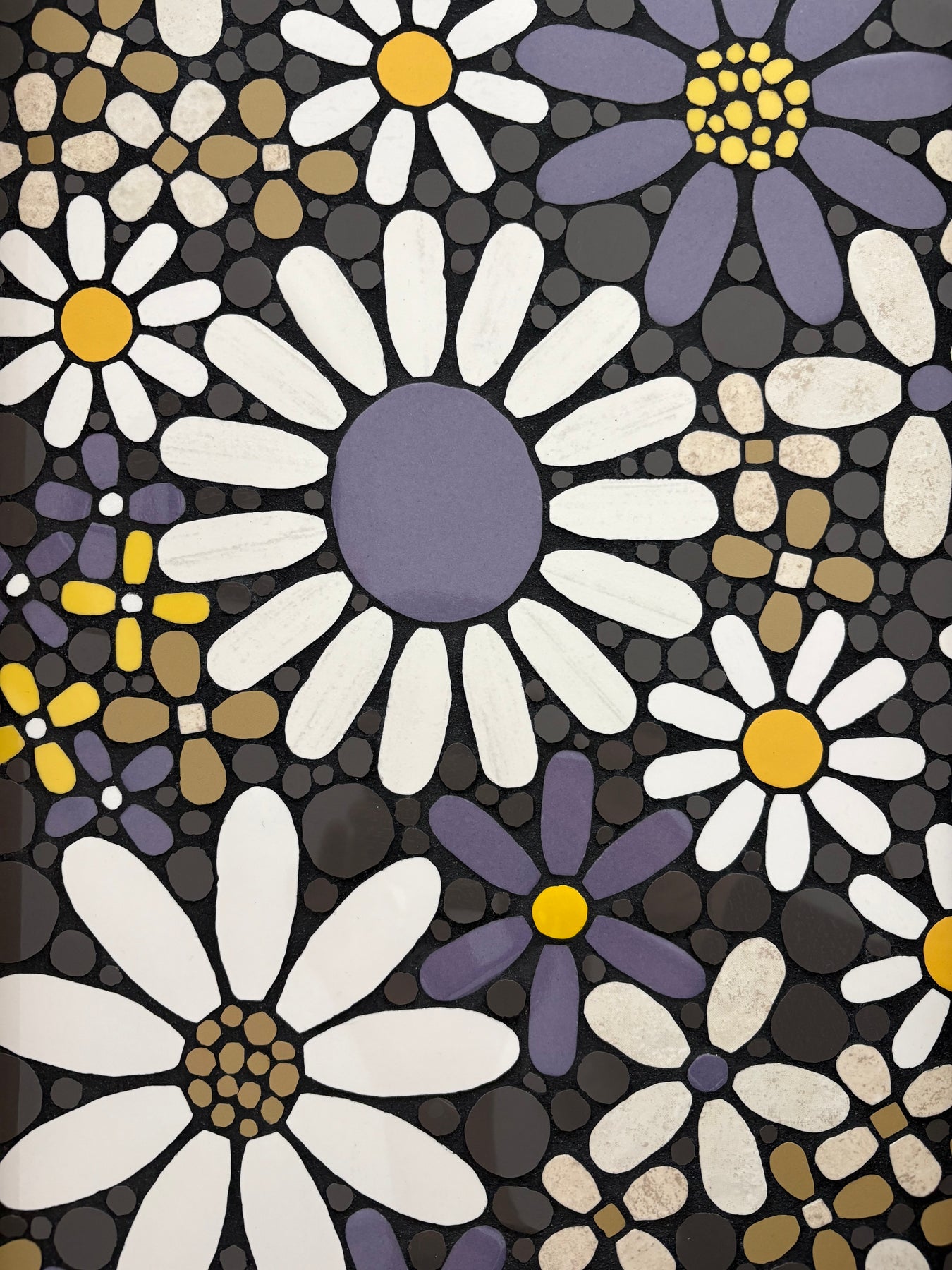 13 x 20" floral mosaic in whites, purple, yellow and gold. Medium stained wood
