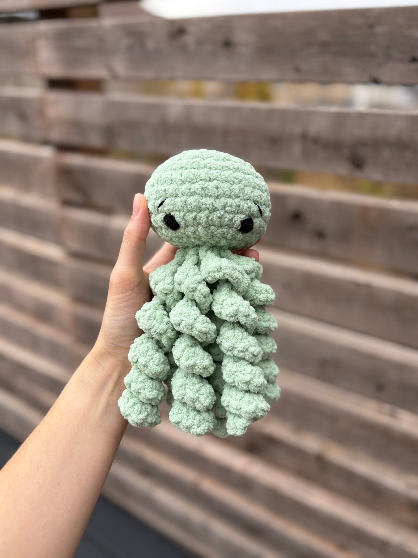 This adorable octopus is the perfect baby gift. The squishy tentacles are perfect for little hands and offer comfort. It is made with a soft, machine-washable, chenille-like yarn, with