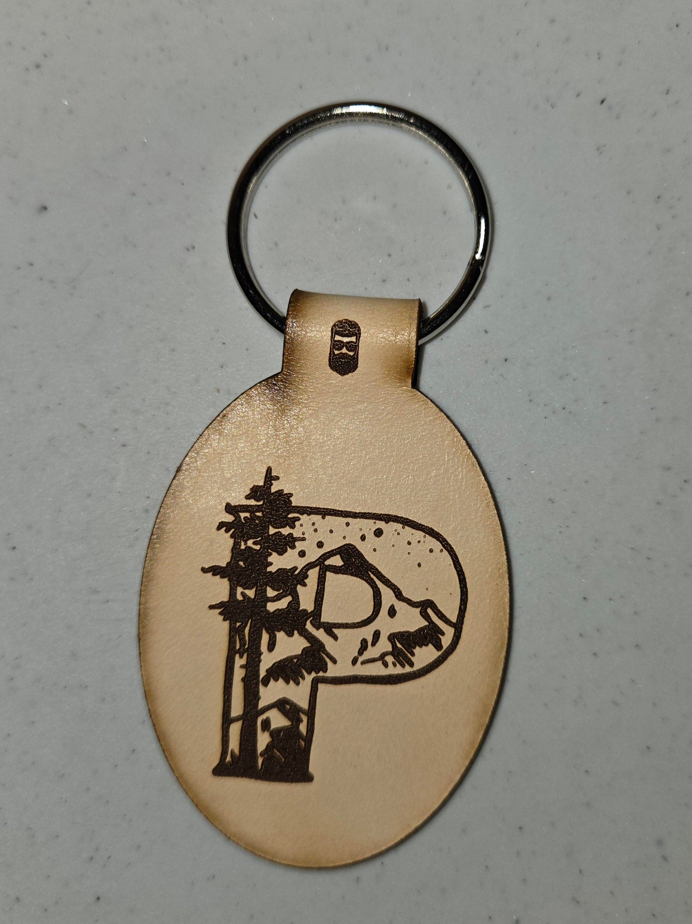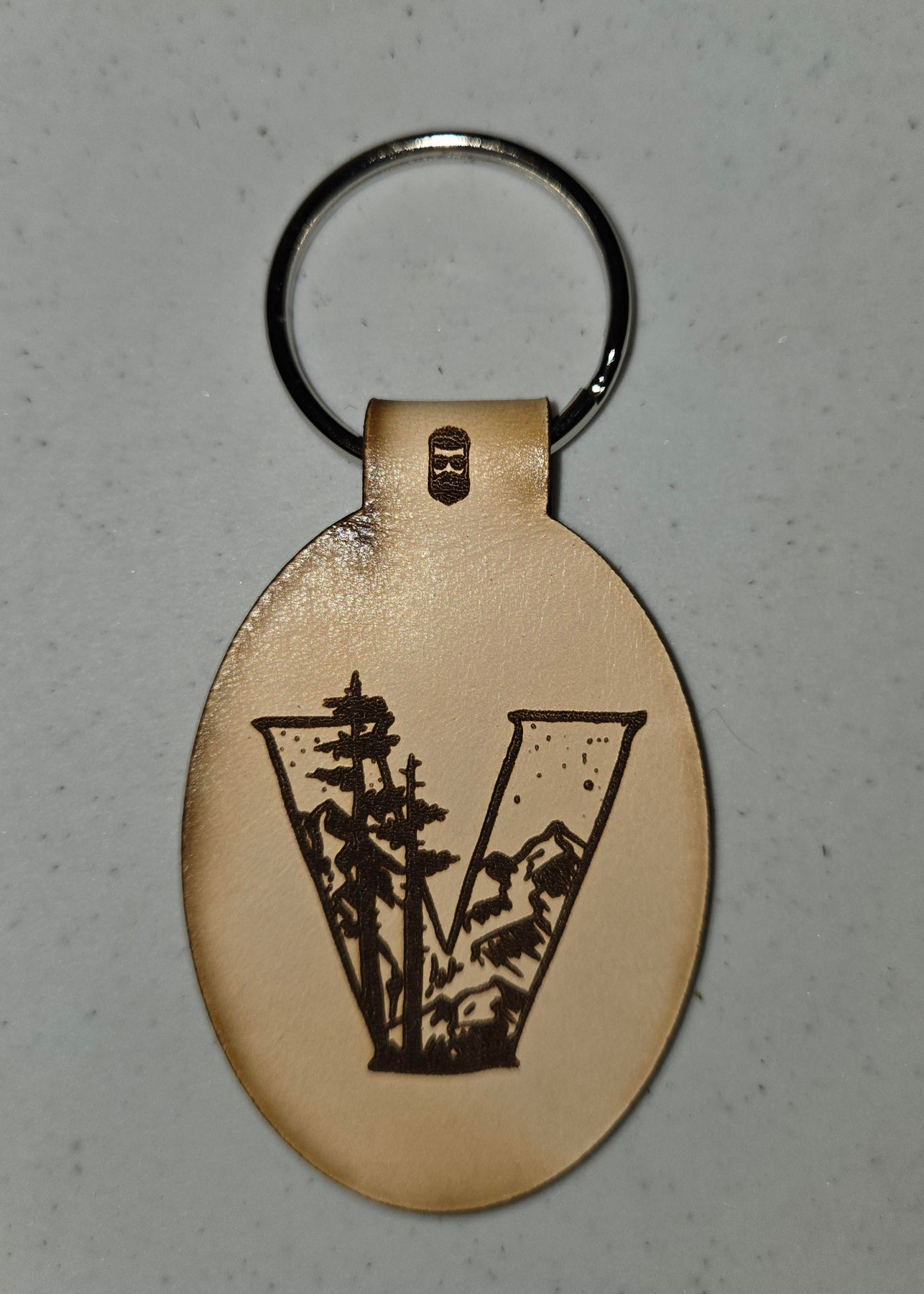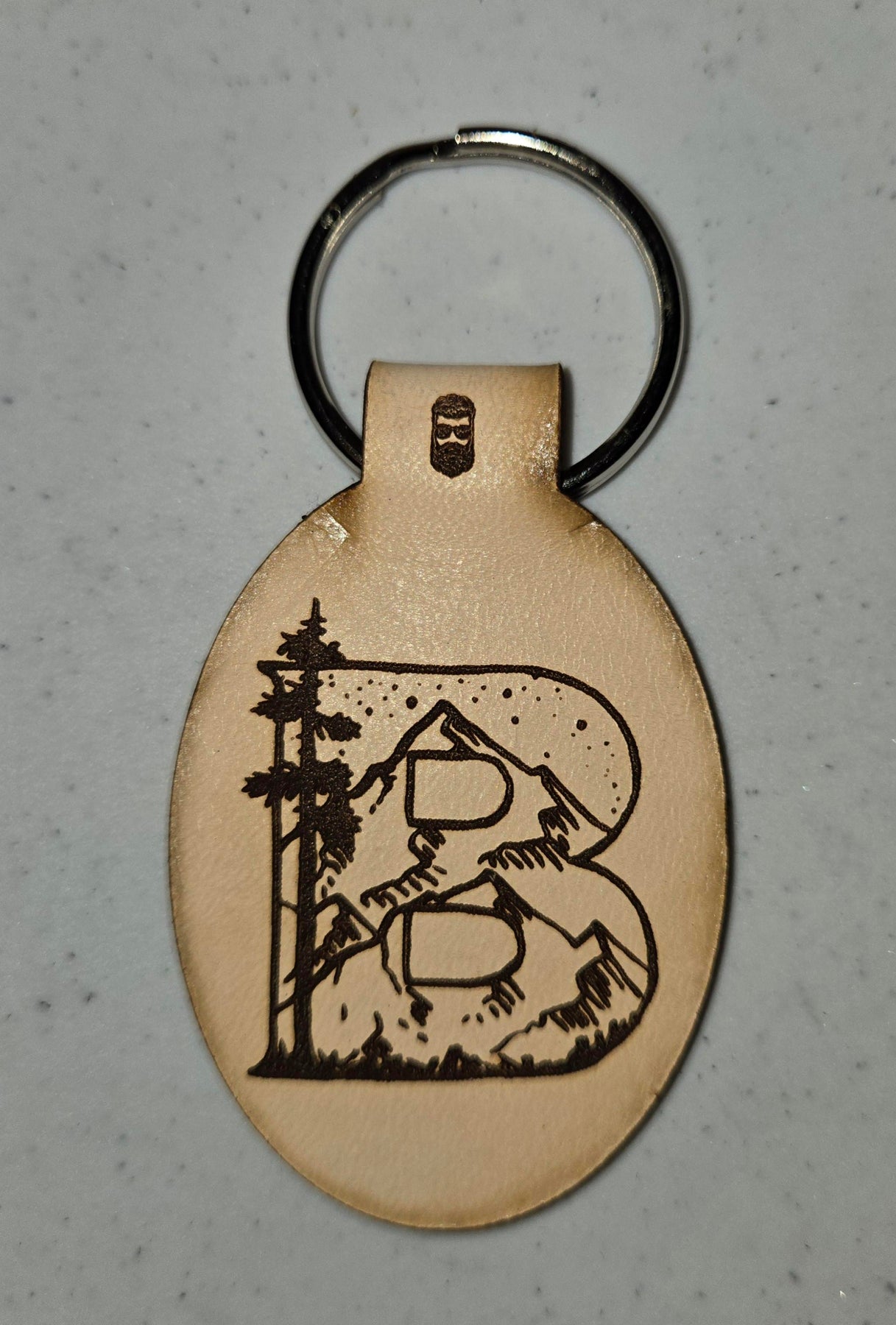 Double sided Laser engraved leather keychains featuring the Great Outdoors themed initials.
