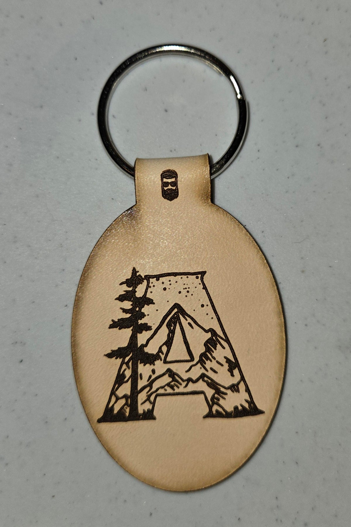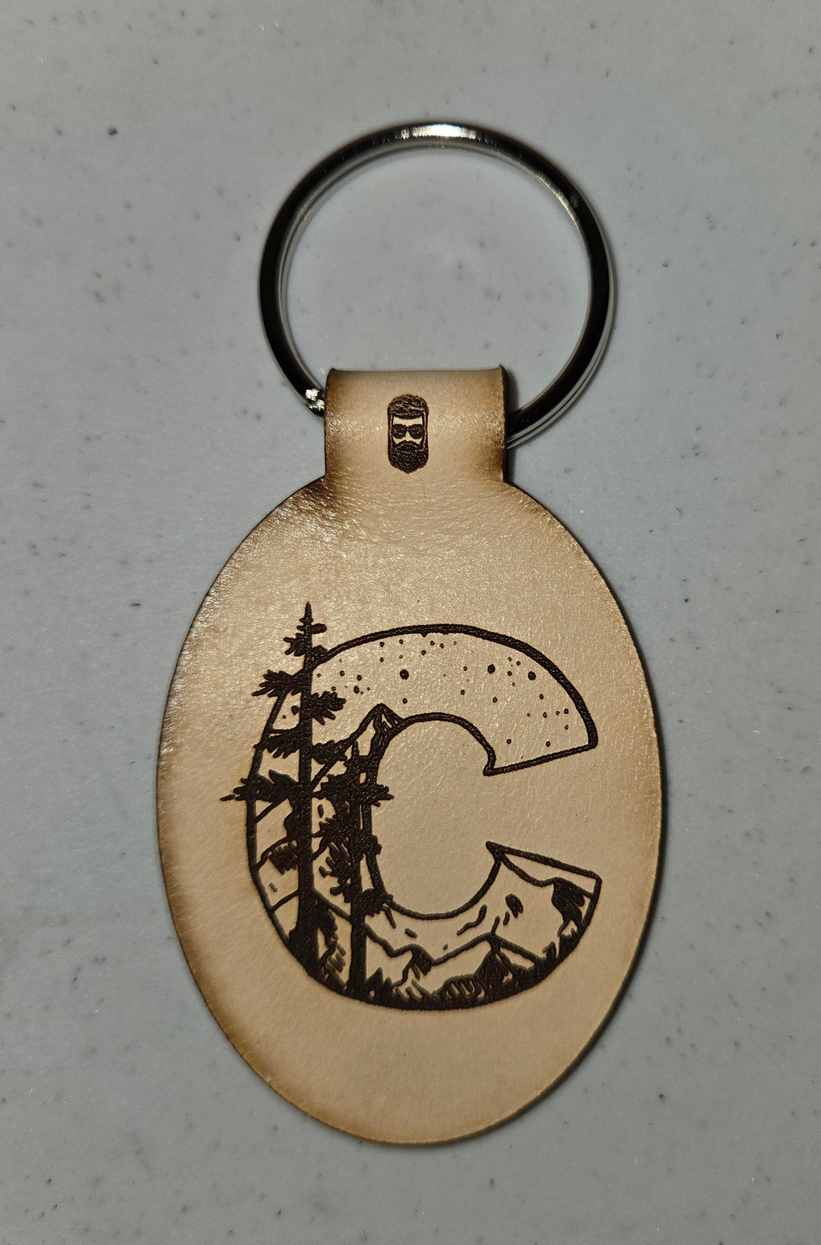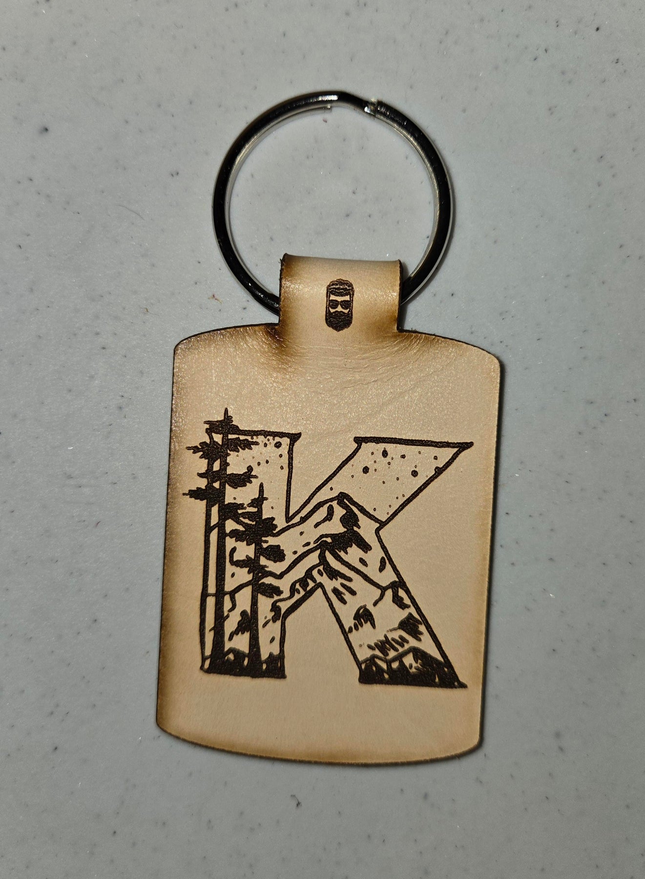 Double sided Laser engraved leather keychains featuring the Great Outdoors themed initials.