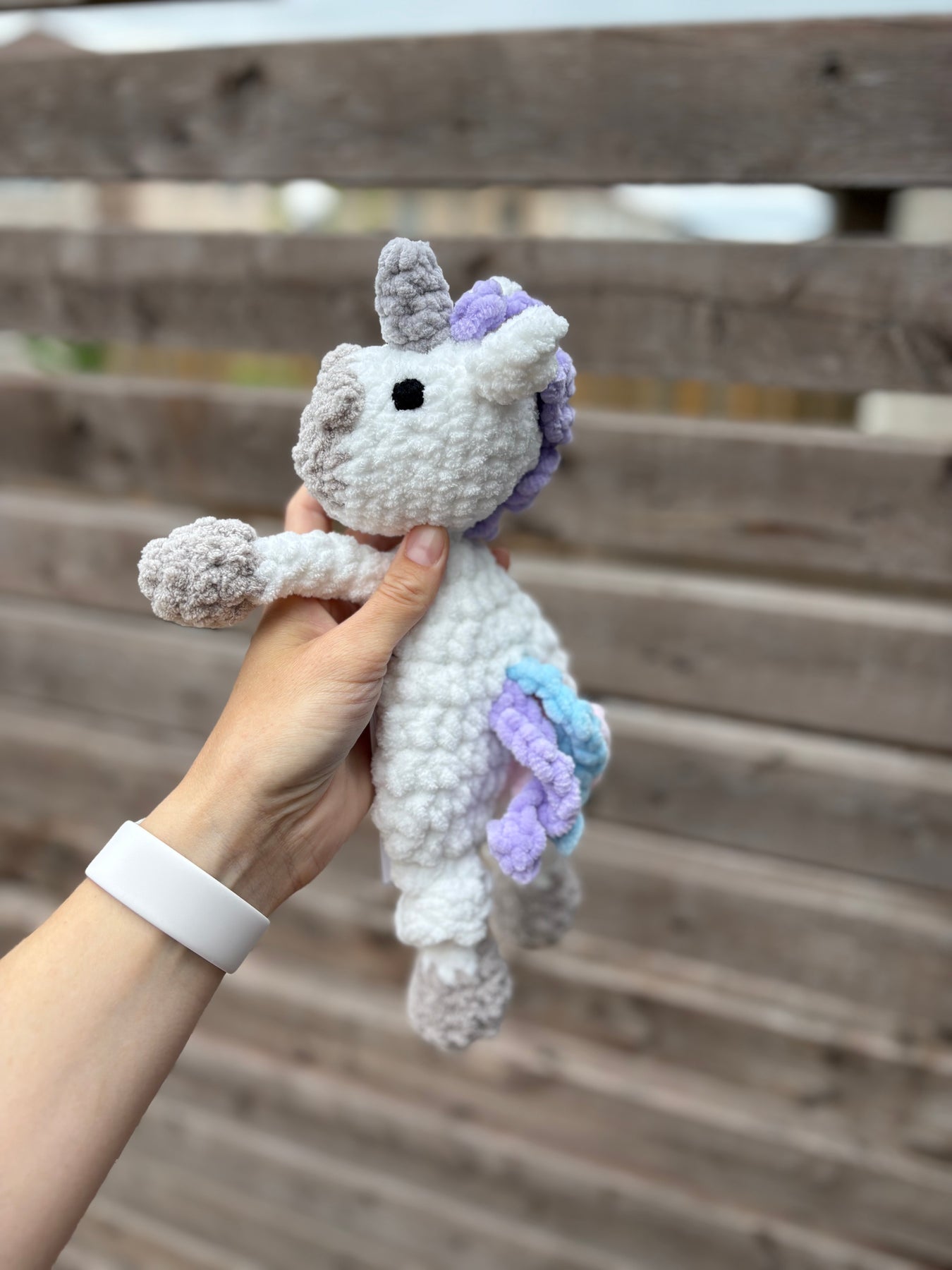 This adorable lillicorn lovey is a combination of a plushie, with a stuffed head, and blanket, with a soft and squishy body. It is perfect for little hands. It is made with a soft, machine-washable, chenille-like yarn, with embroidered eyes (no buttons or snaps).