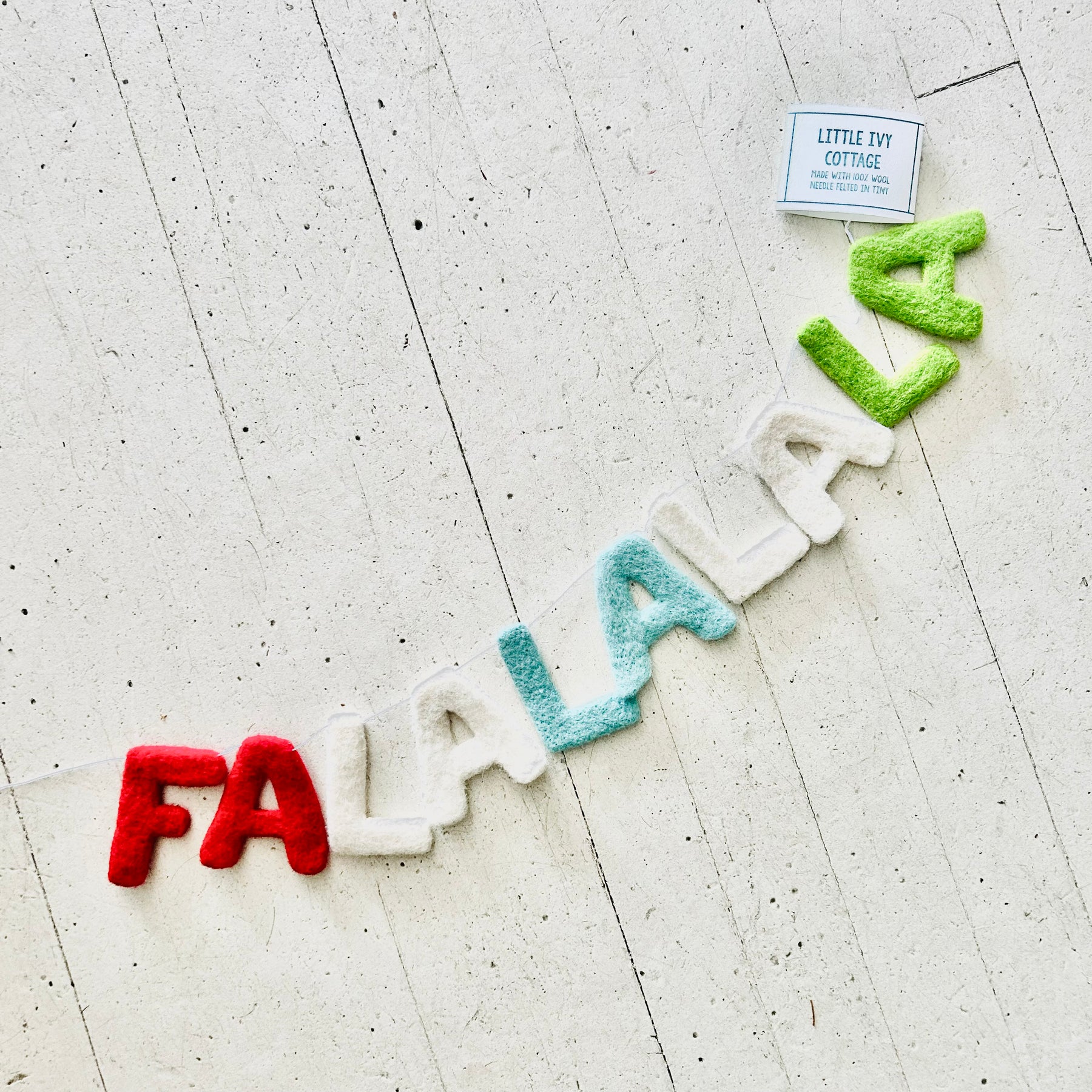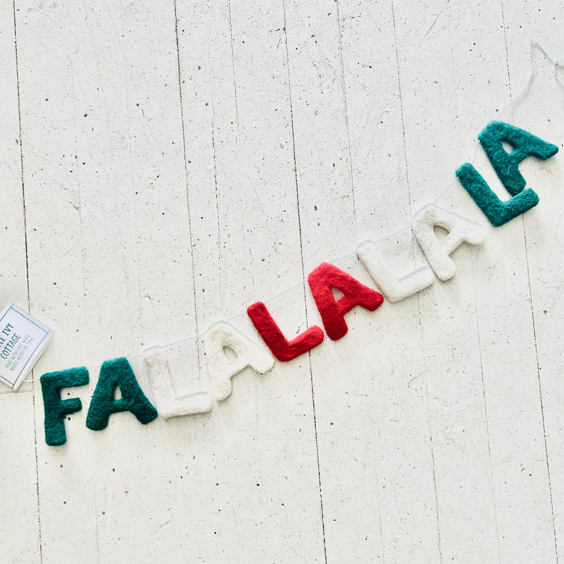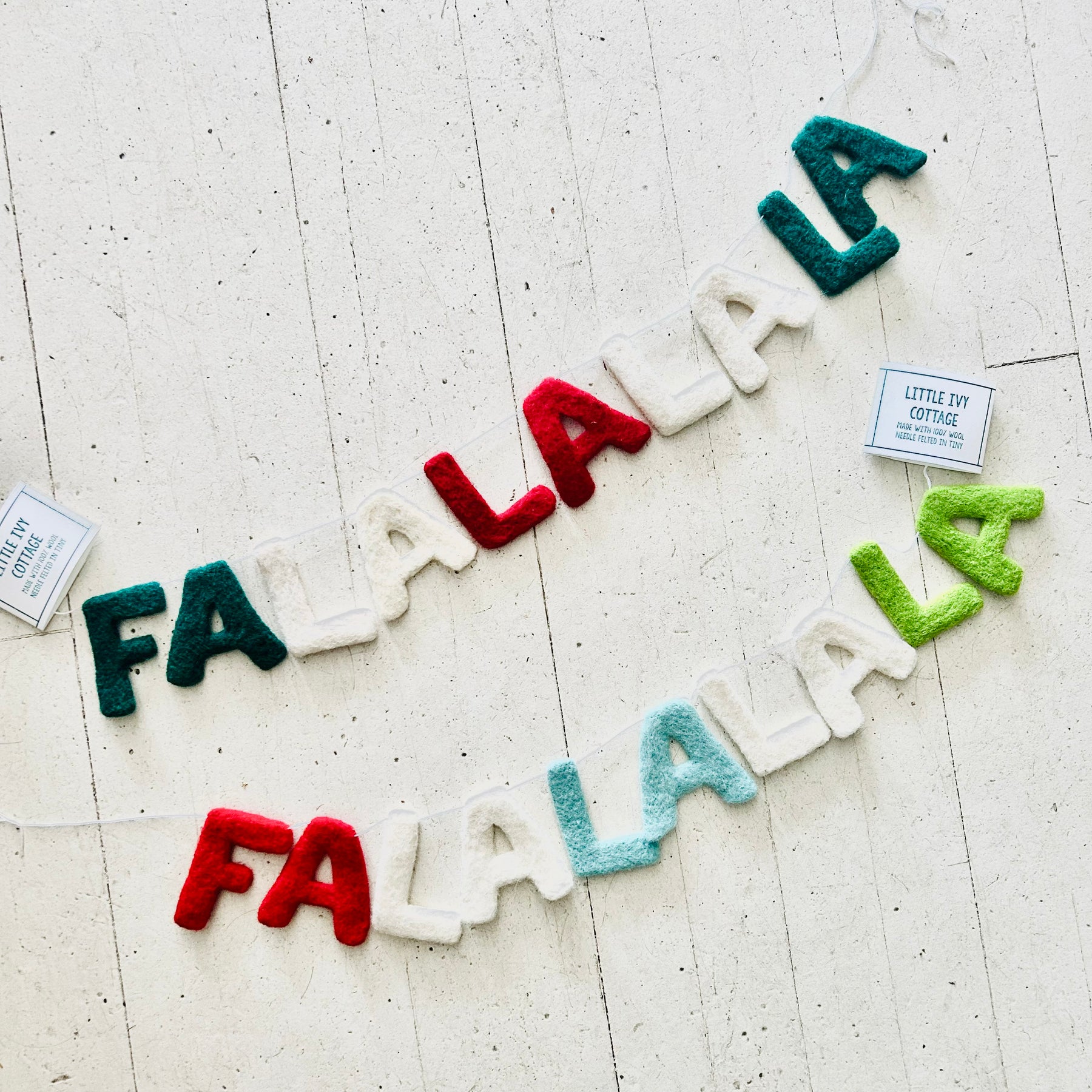 Add warmth, colour, and texture to your holiday décor with this cheerful hand-felted garland. Measuring up to 6 feet long with adjustable spacing, it features soft needle-felted, wool letters spelling “Fa La La La La” in traditional and vintage Christmas colours.