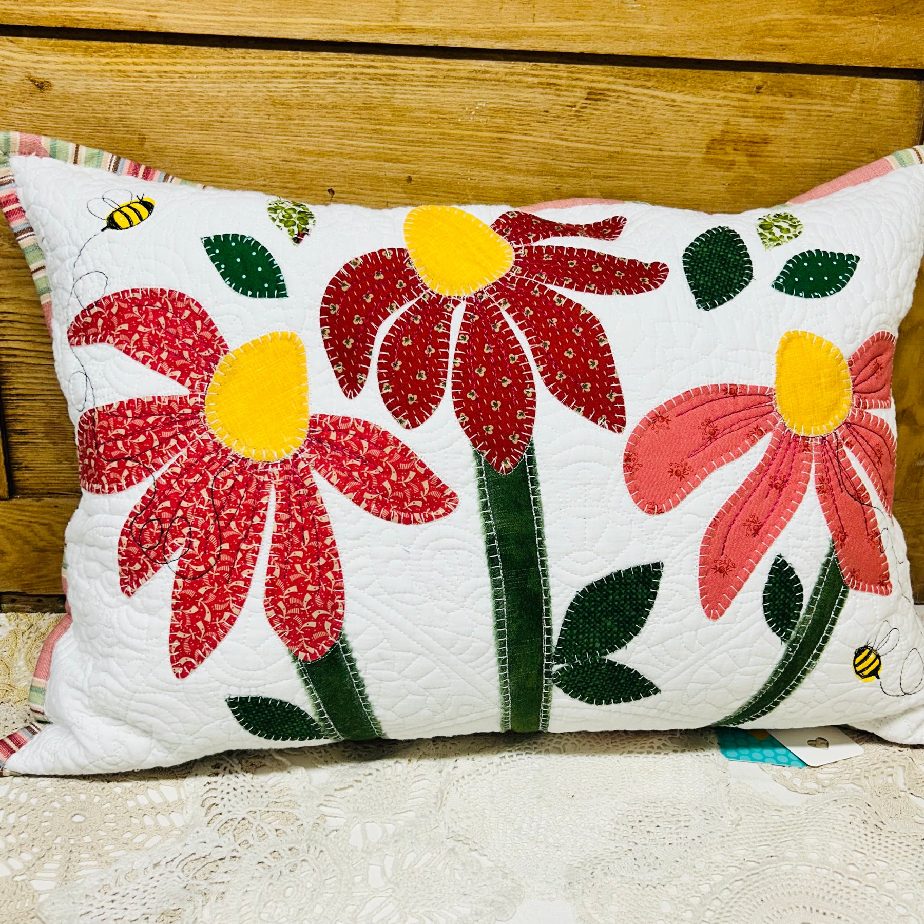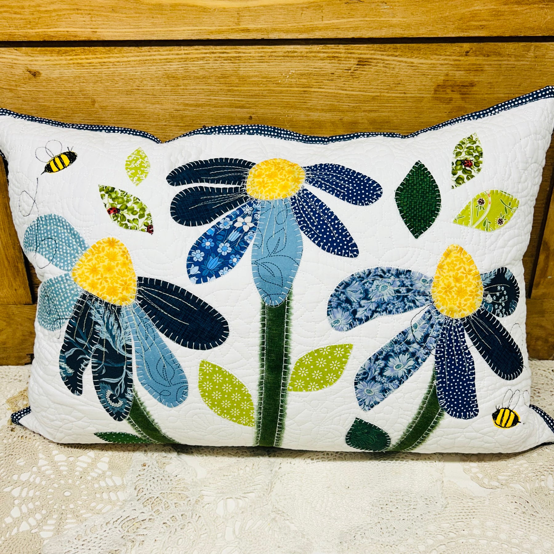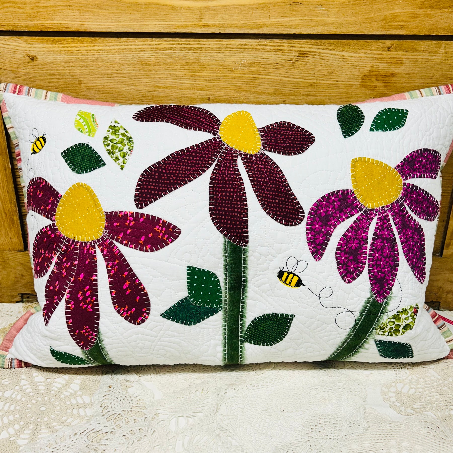 Appliqued and hand stitched cone flowers in a variety of colours and patterns on a quilted background. Complete with feather insert and zipper.