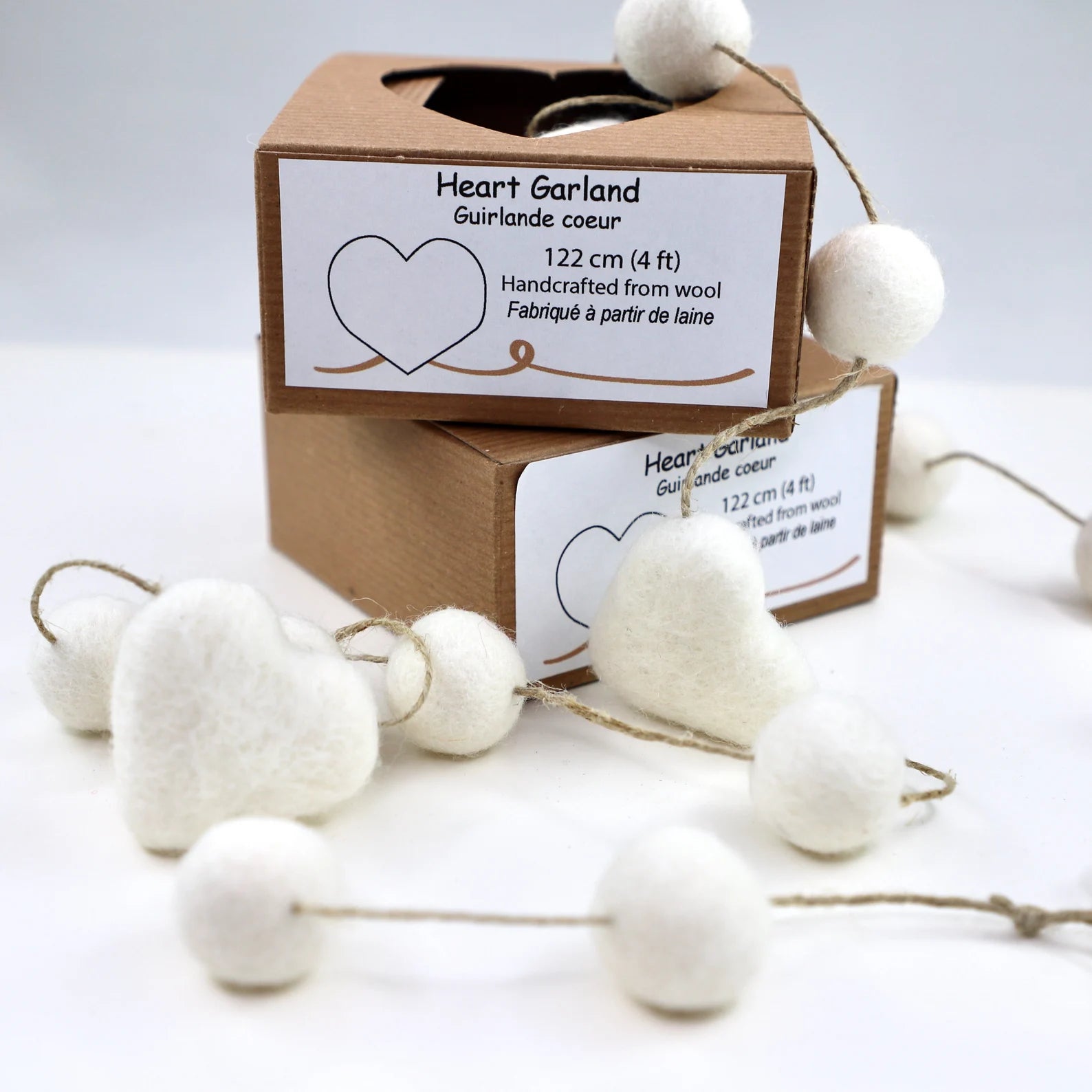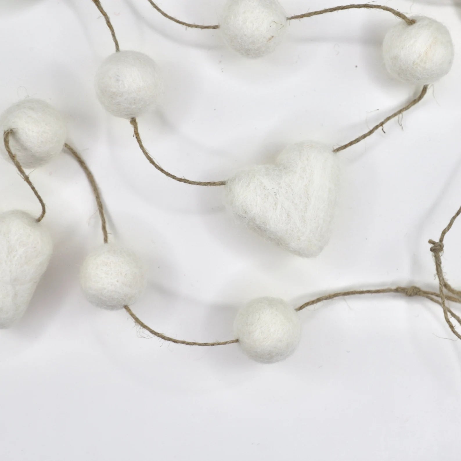 The garland is handcraft using 100% wool felted balls and hearts. They are strung on a hemp cord. The balls are approx. 2cm (1”) in size they will vary slightly as they are handmade. The hearts are approx. 5cm (2”) in size.
