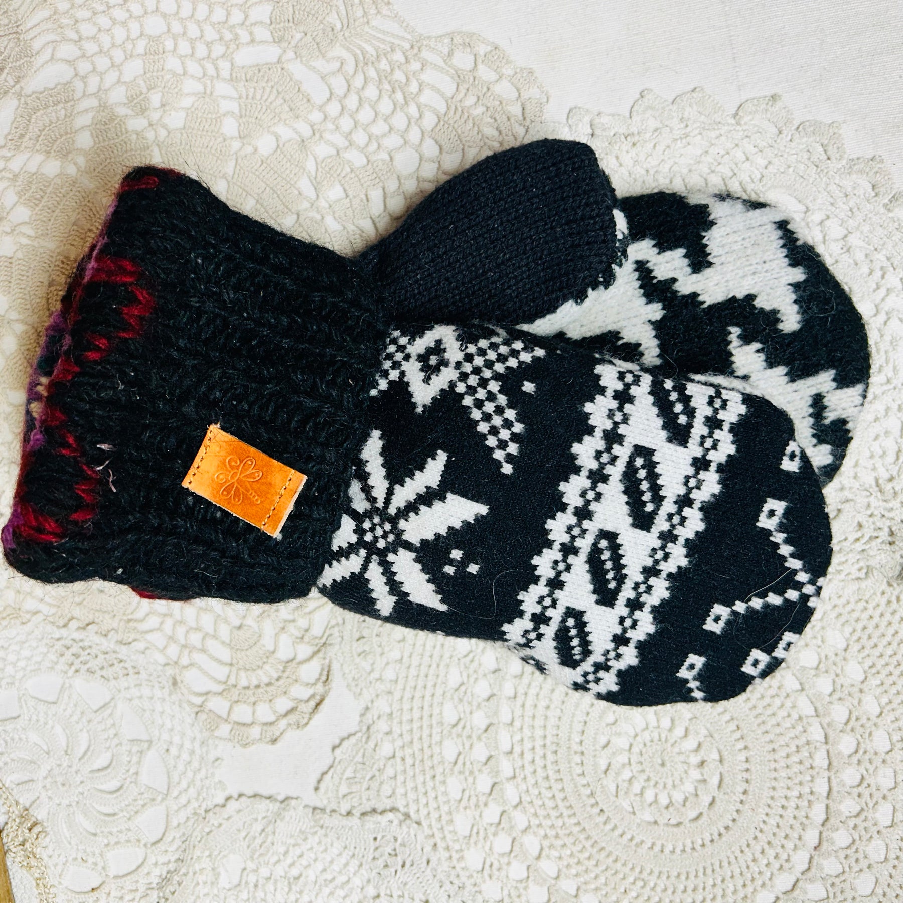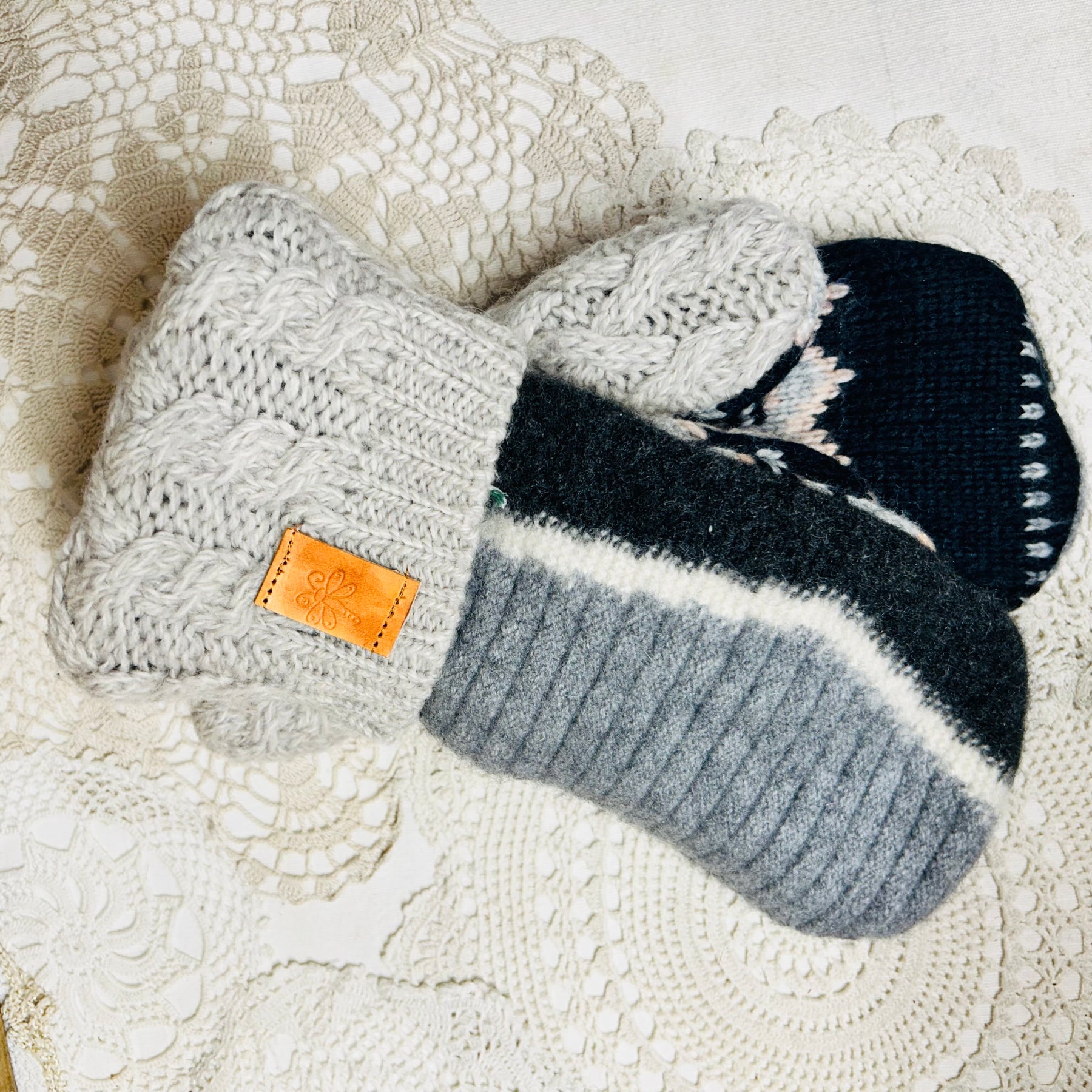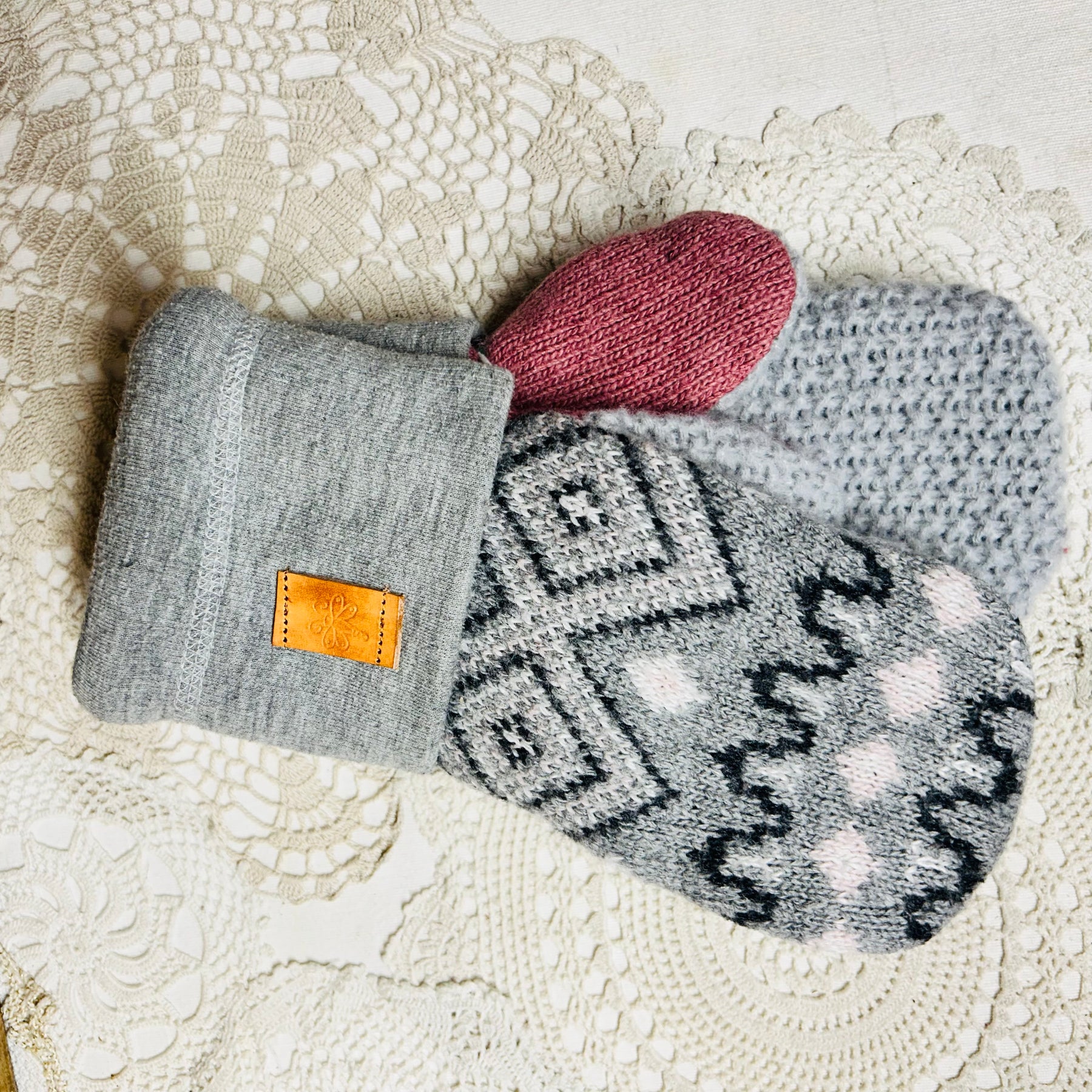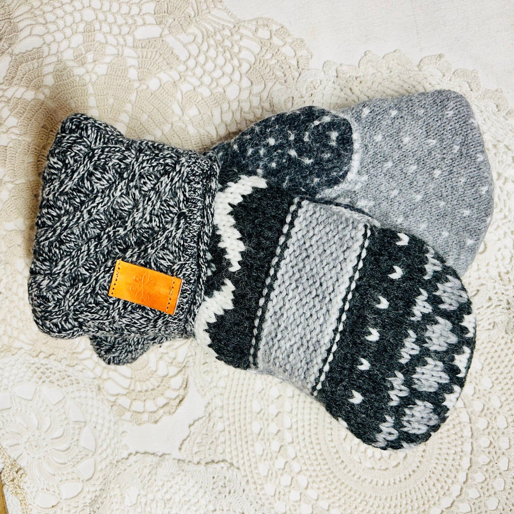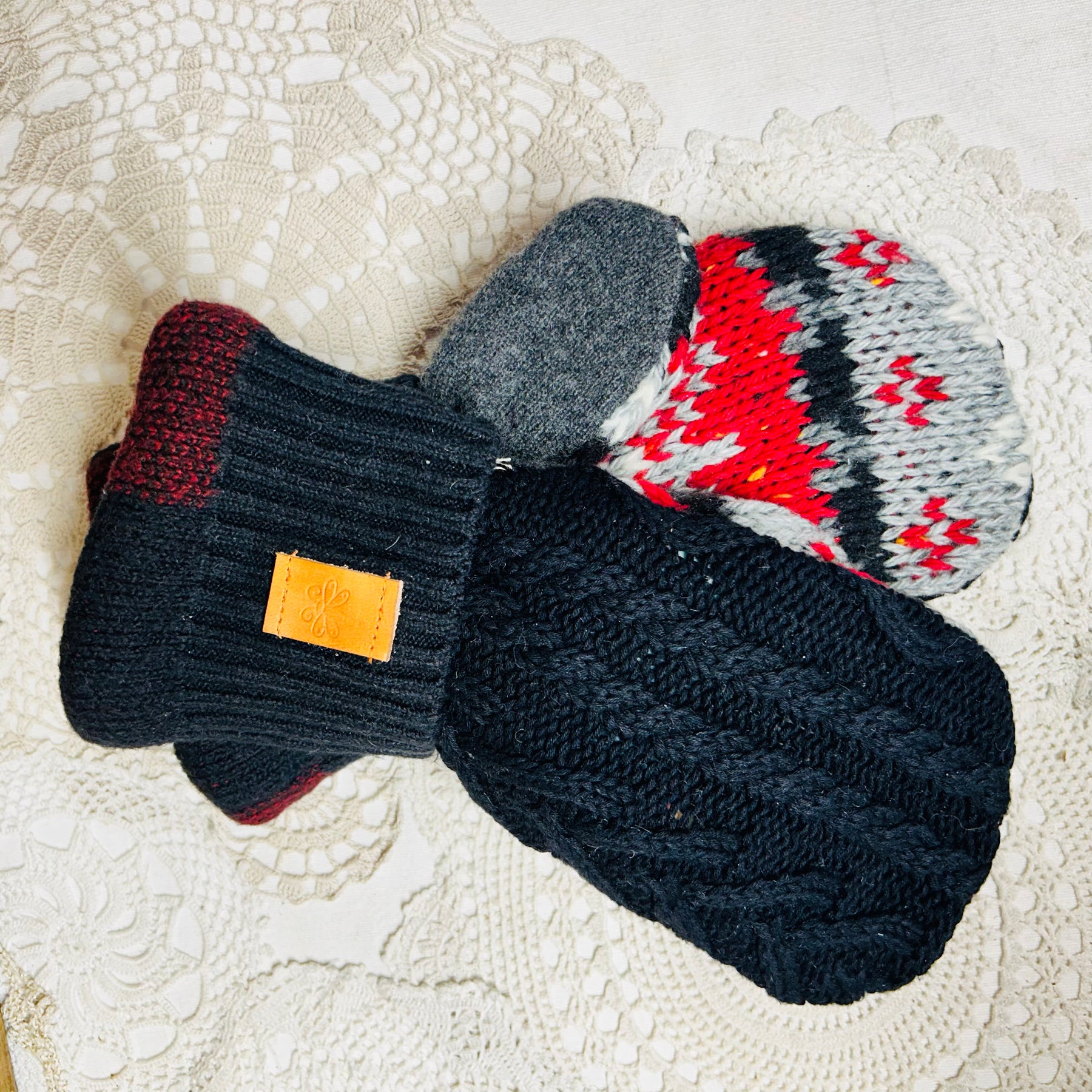 Multiple quantities of same mitt are made out of the same sweater but will vary in pattern layout and knit and fleece colours.