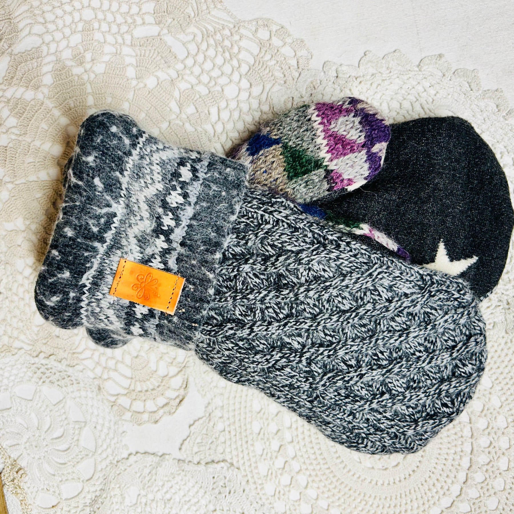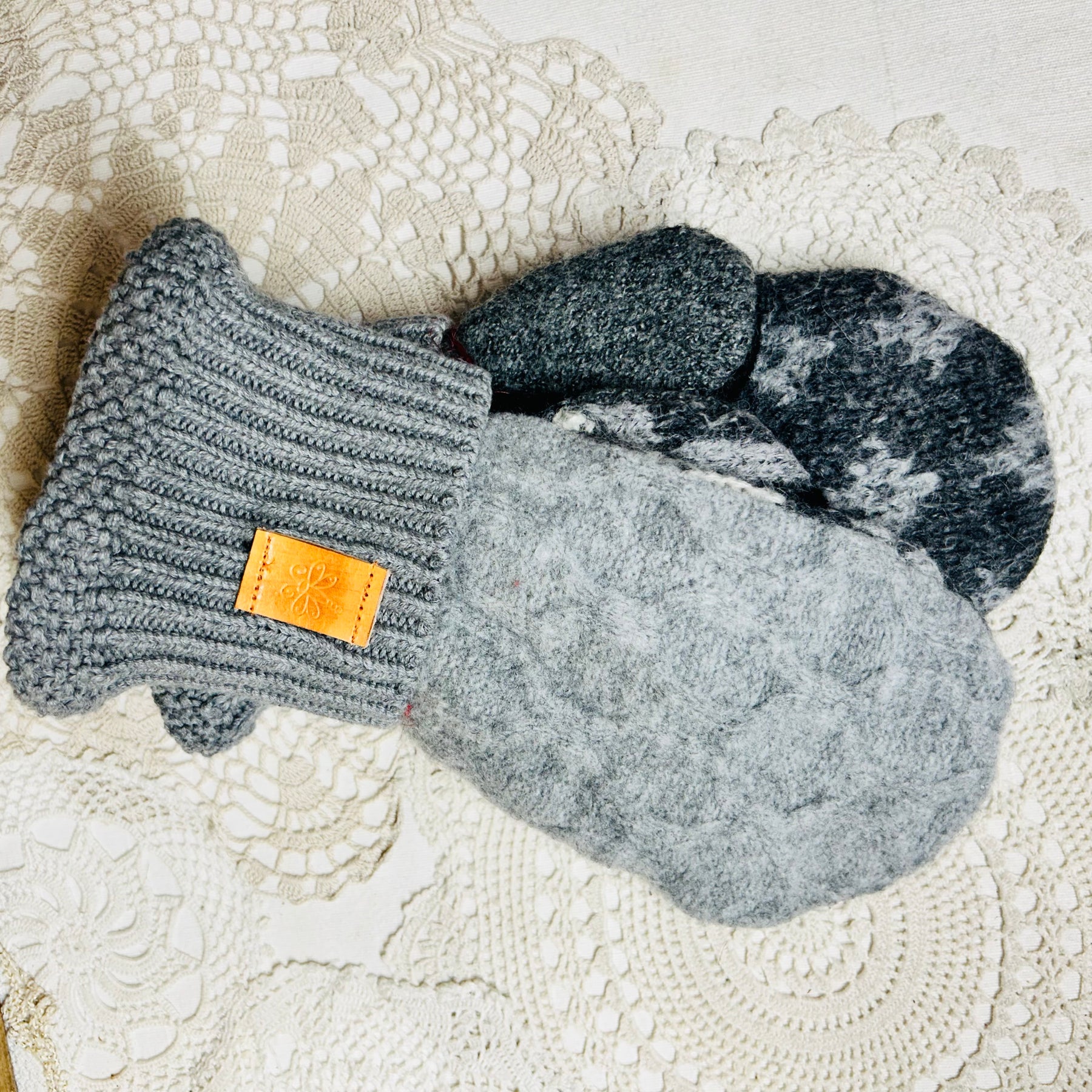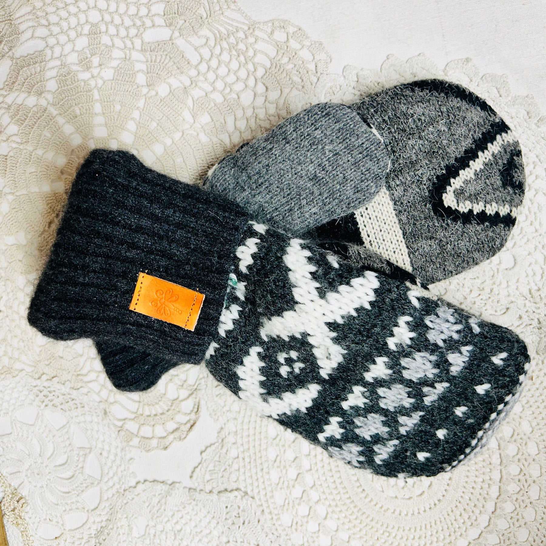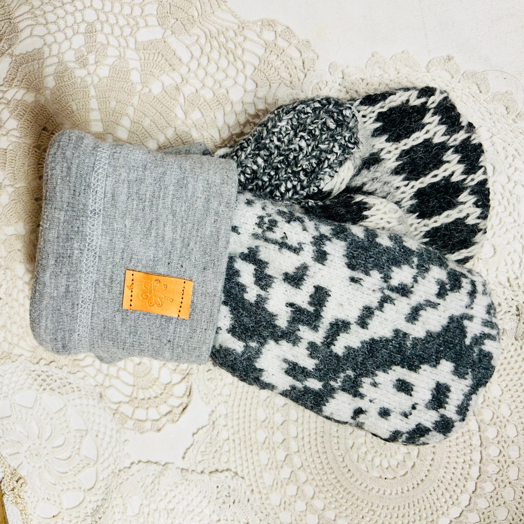 Multiple quantities of same mitt are made out of the same sweater but will vary in pattern layout and knit and fleece colours.