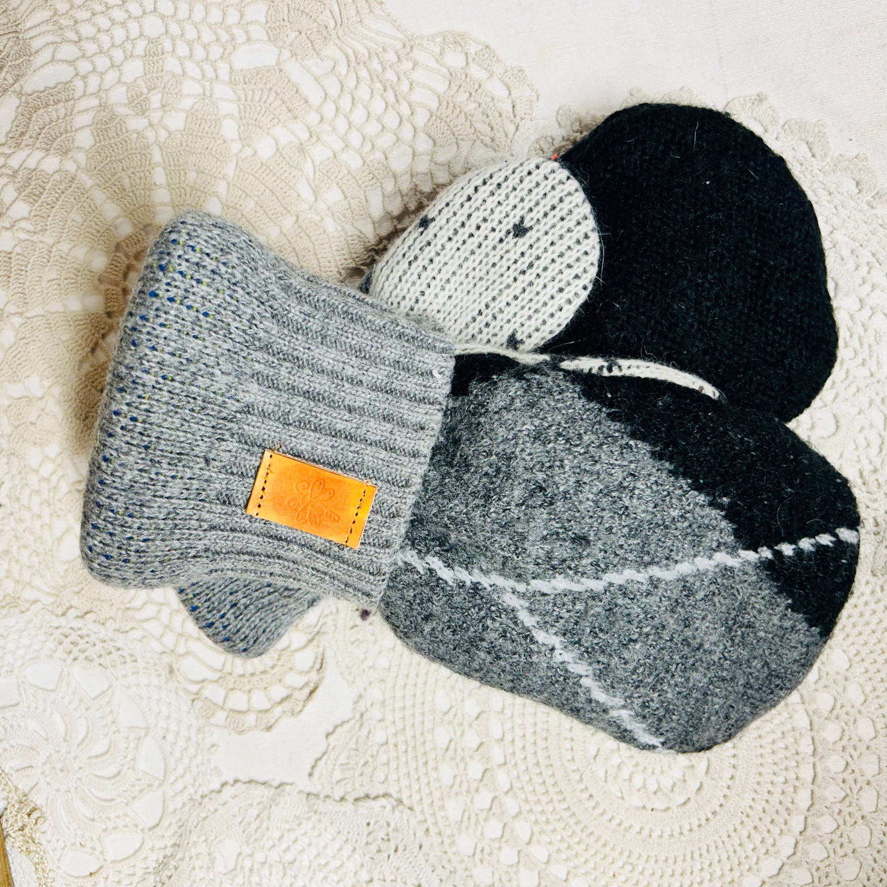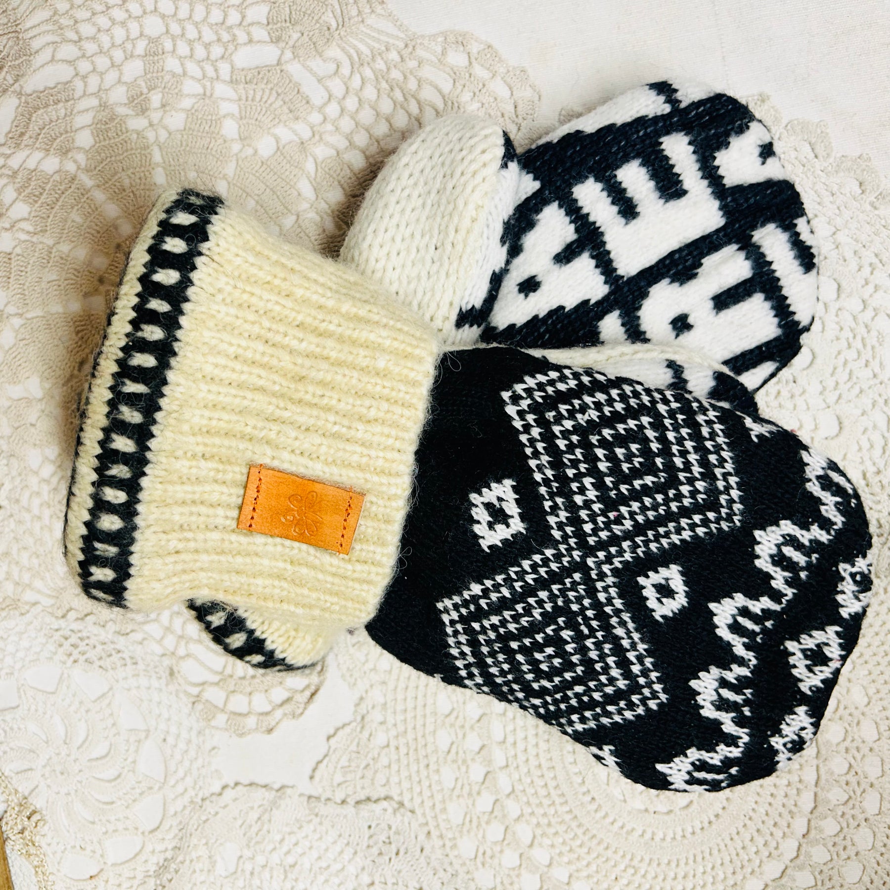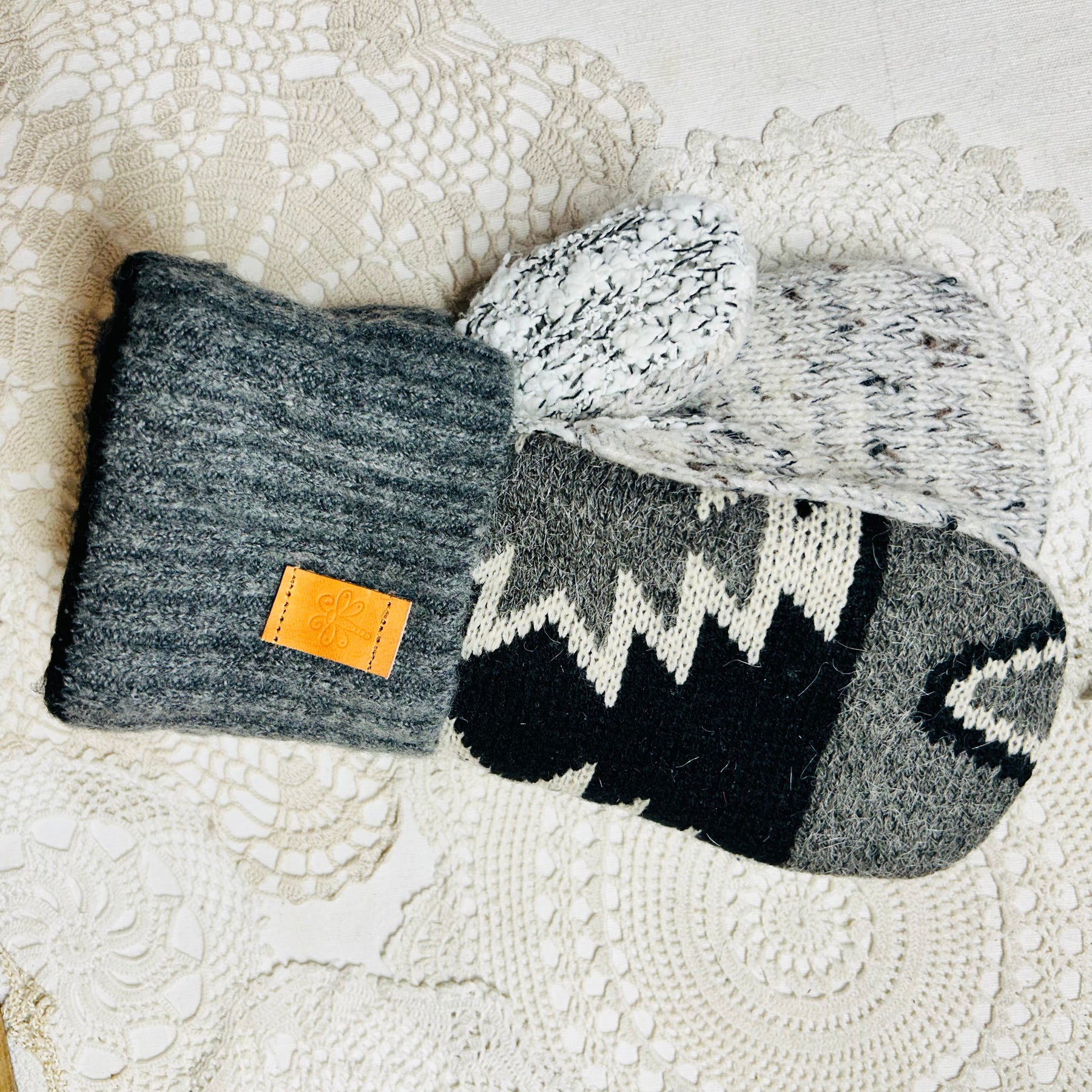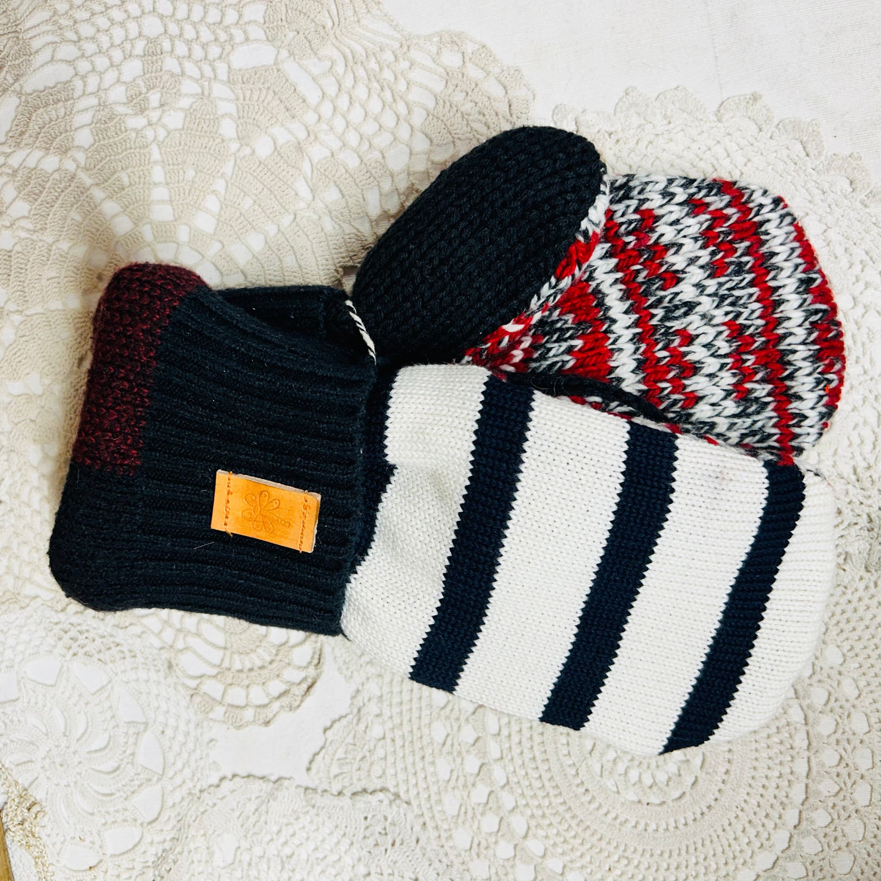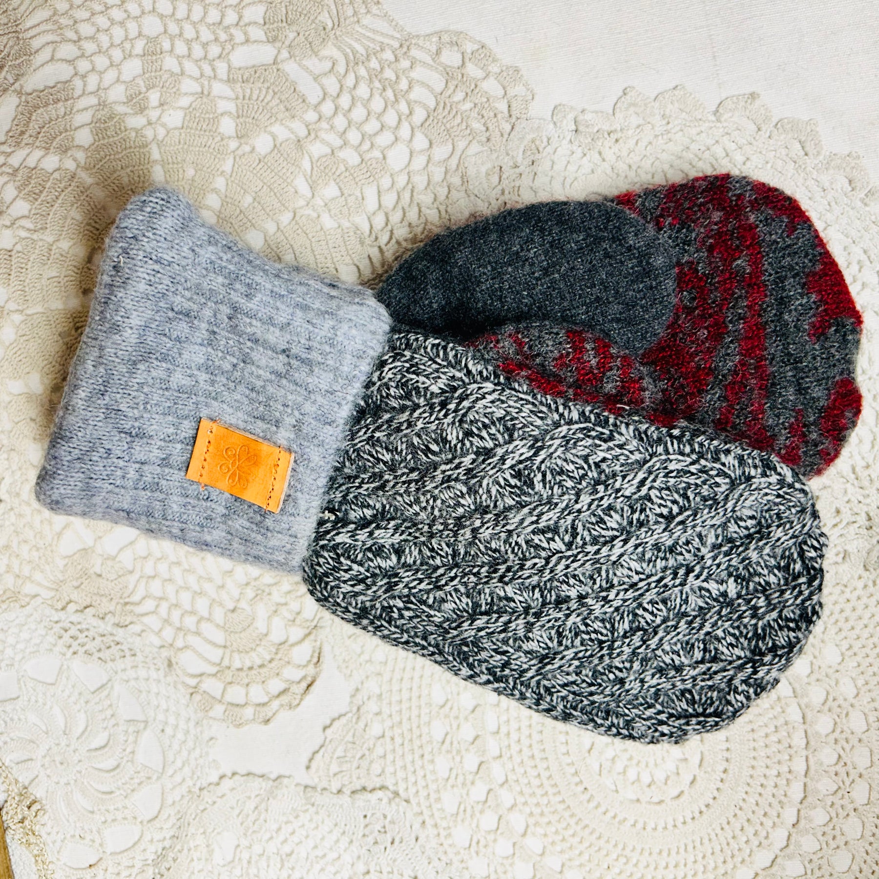 Multiple quantities of same mitt are made out of the same sweater but will vary in pattern layout and knit and fleece colours.