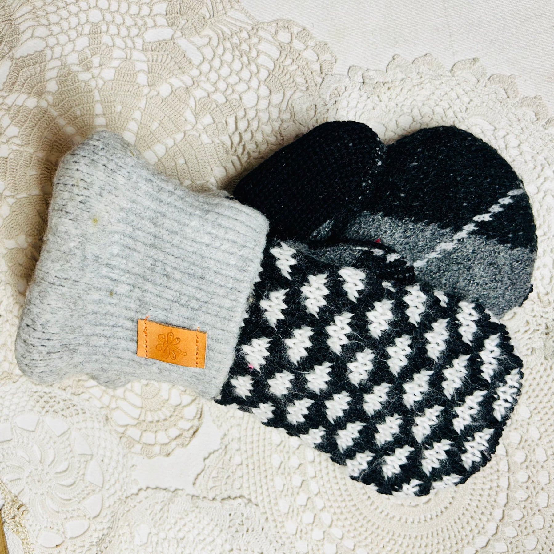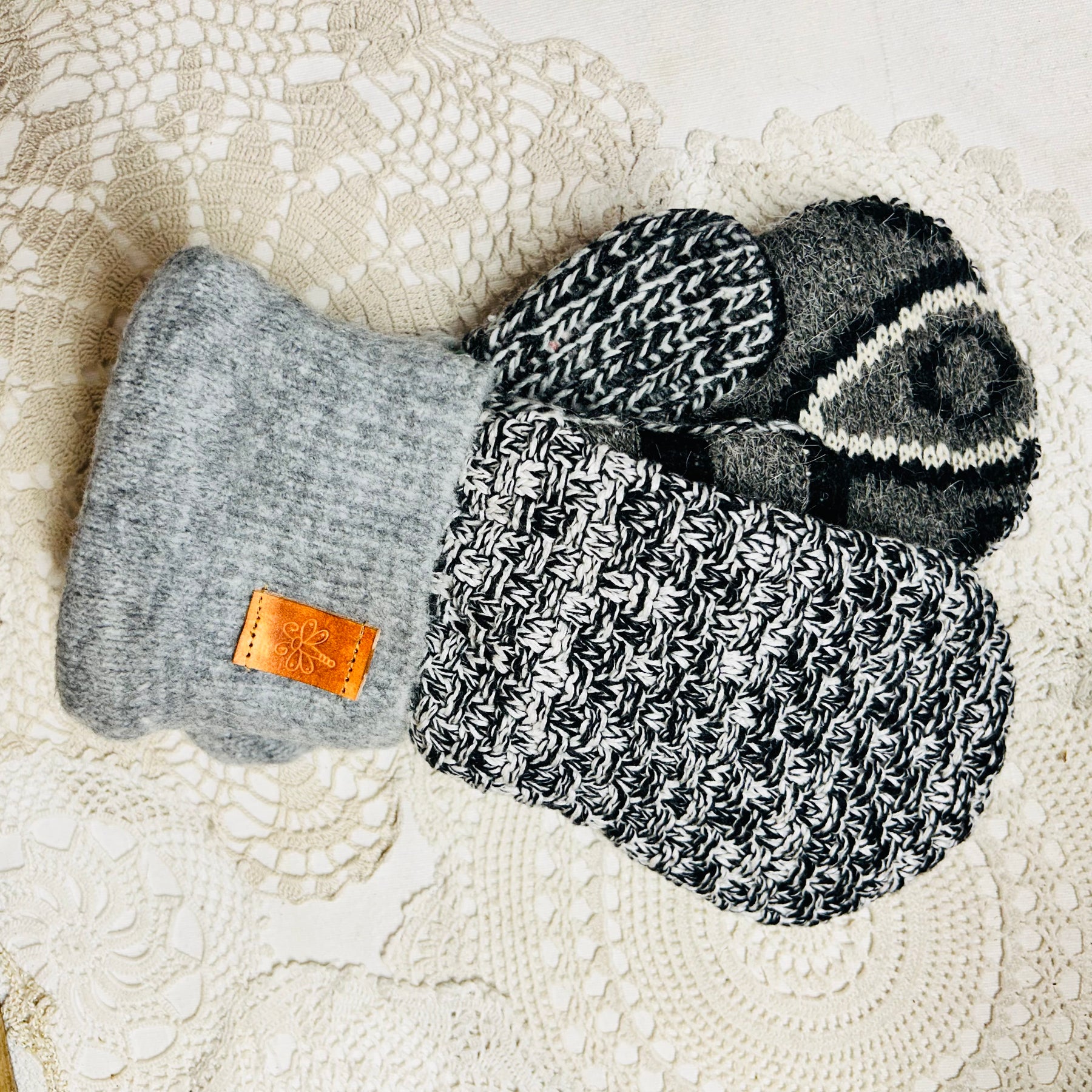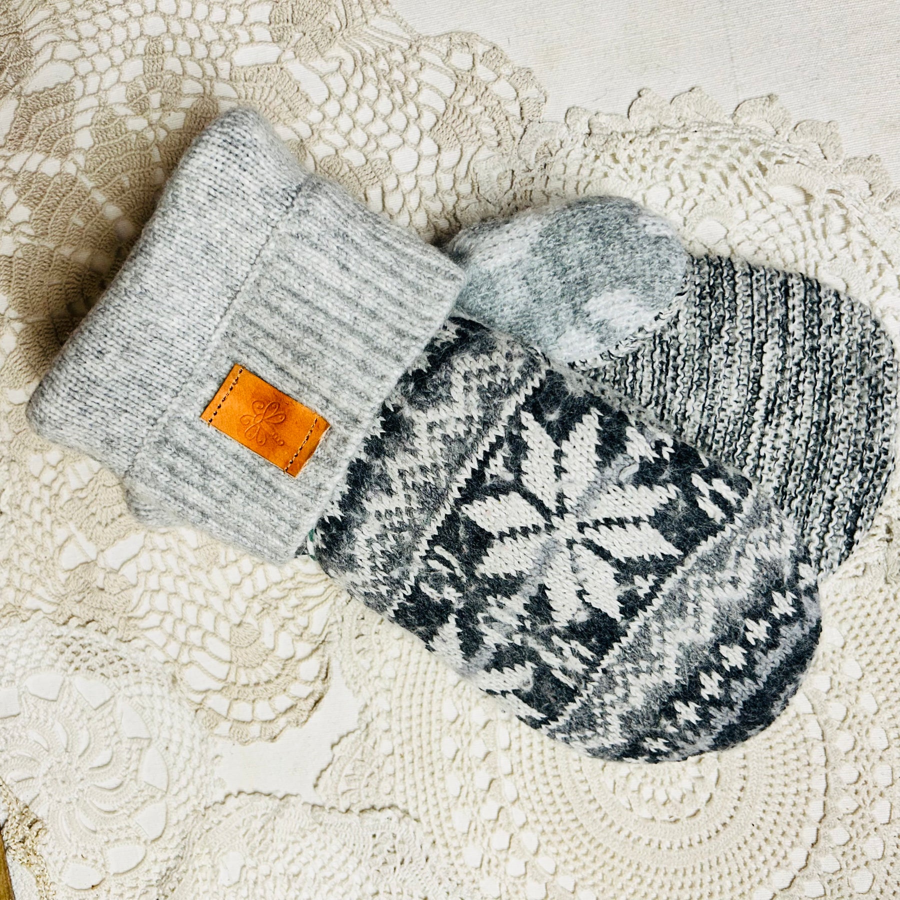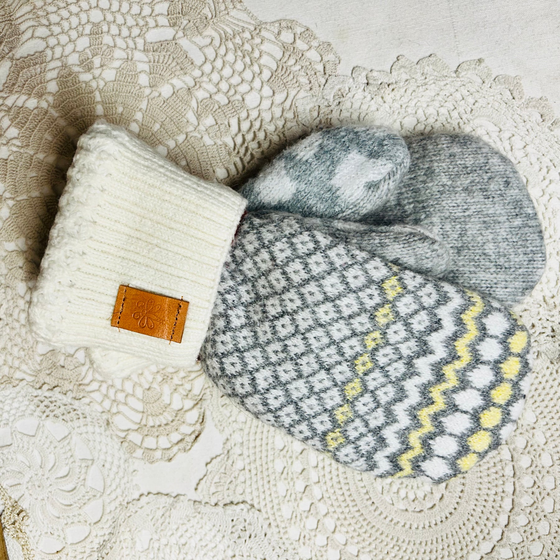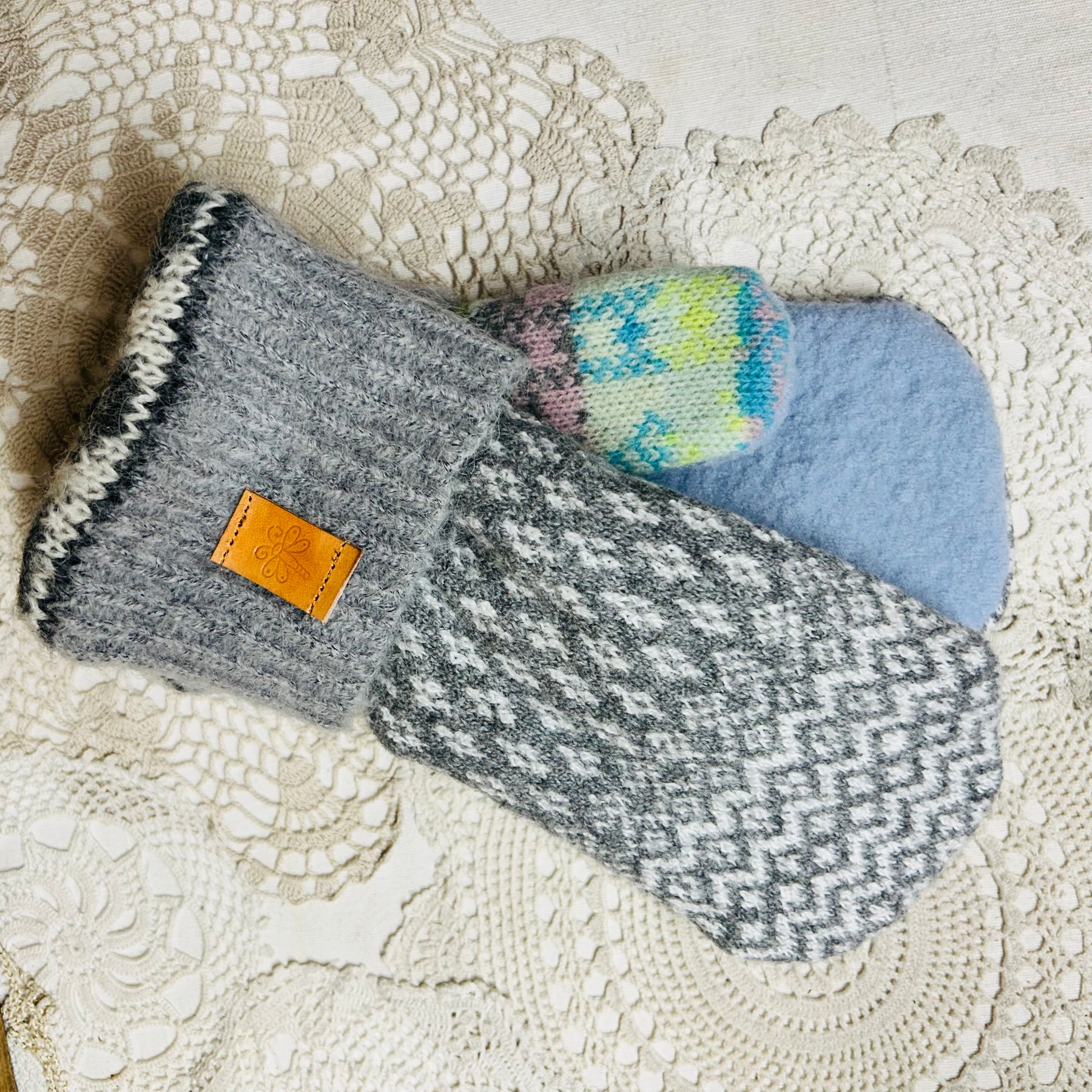 Multiple quantities of same mitt are made out of the same sweater but will vary in pattern layout and knit and fleece colours.