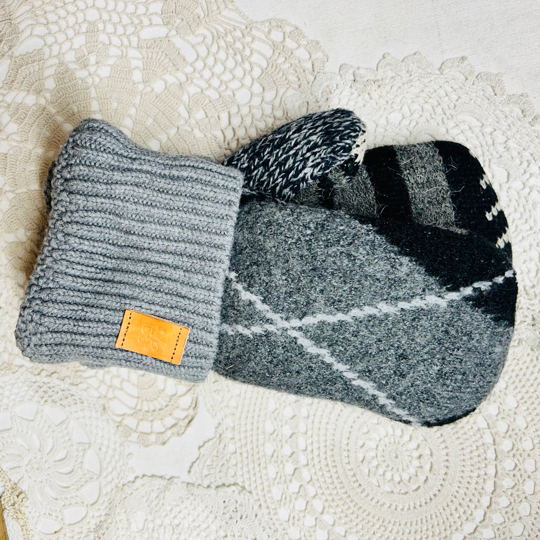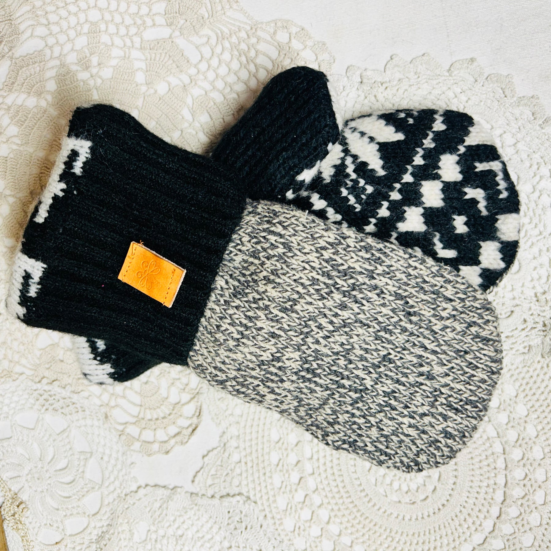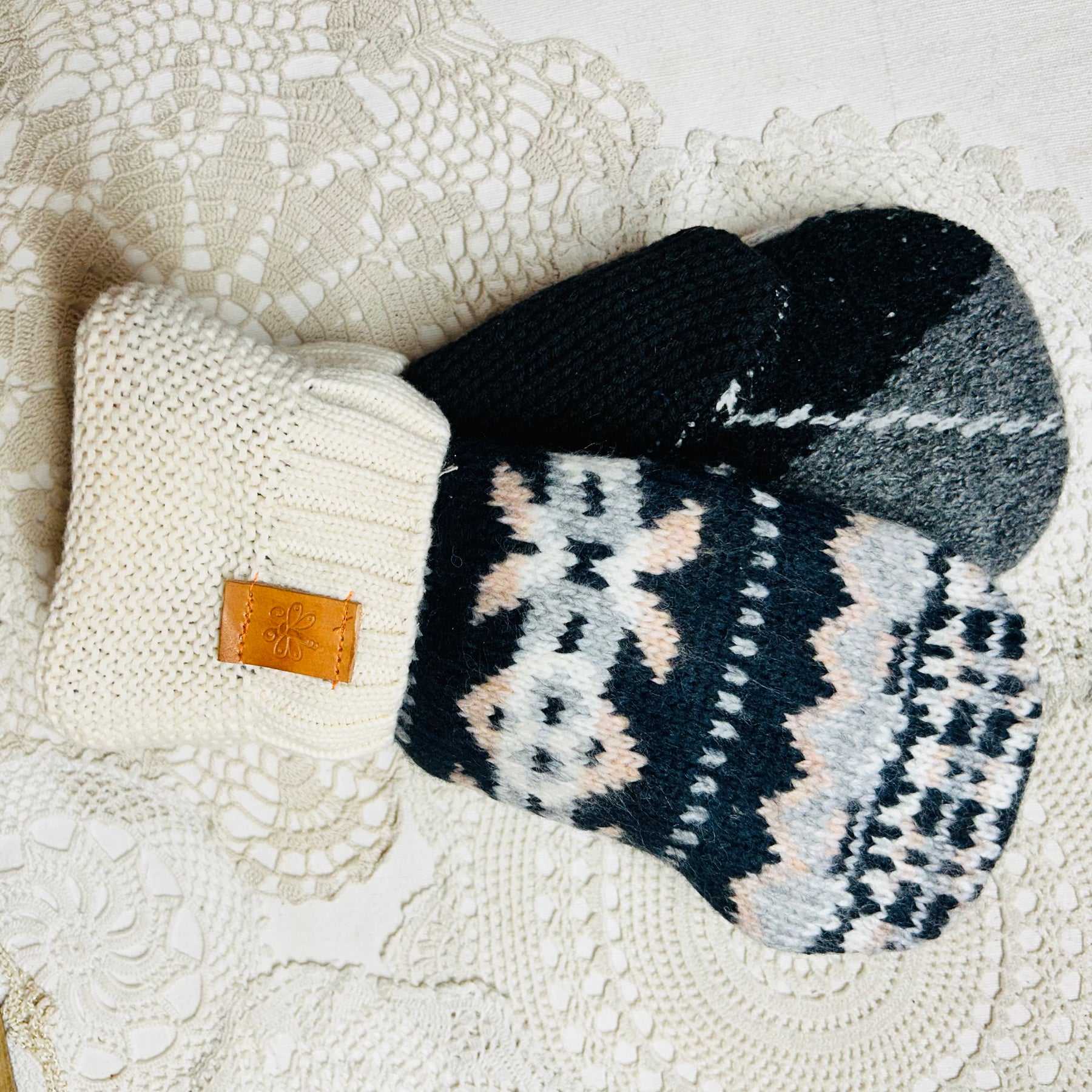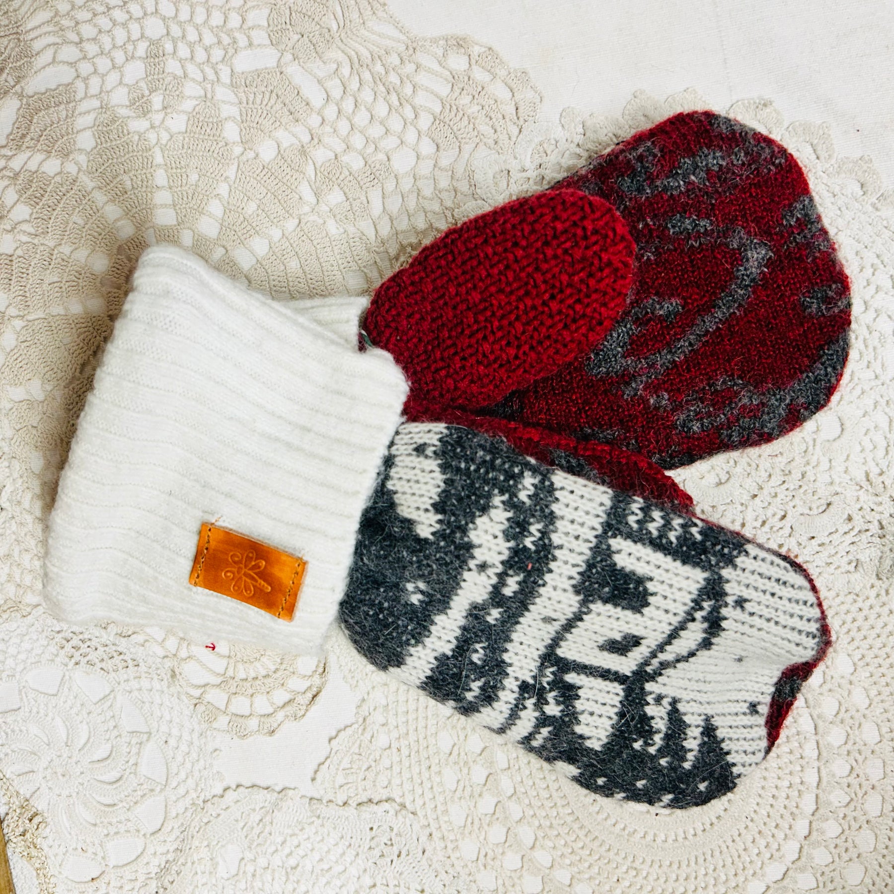 Multiple quantities of same mitt are made out of the same sweater but will vary in pattern layout and knit and fleece colours.