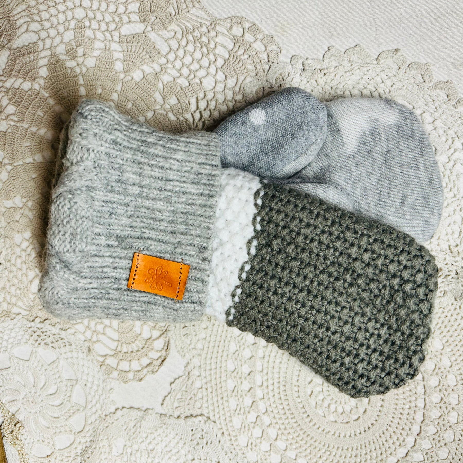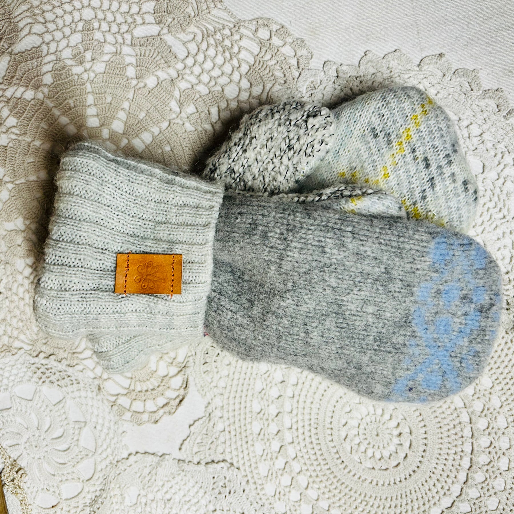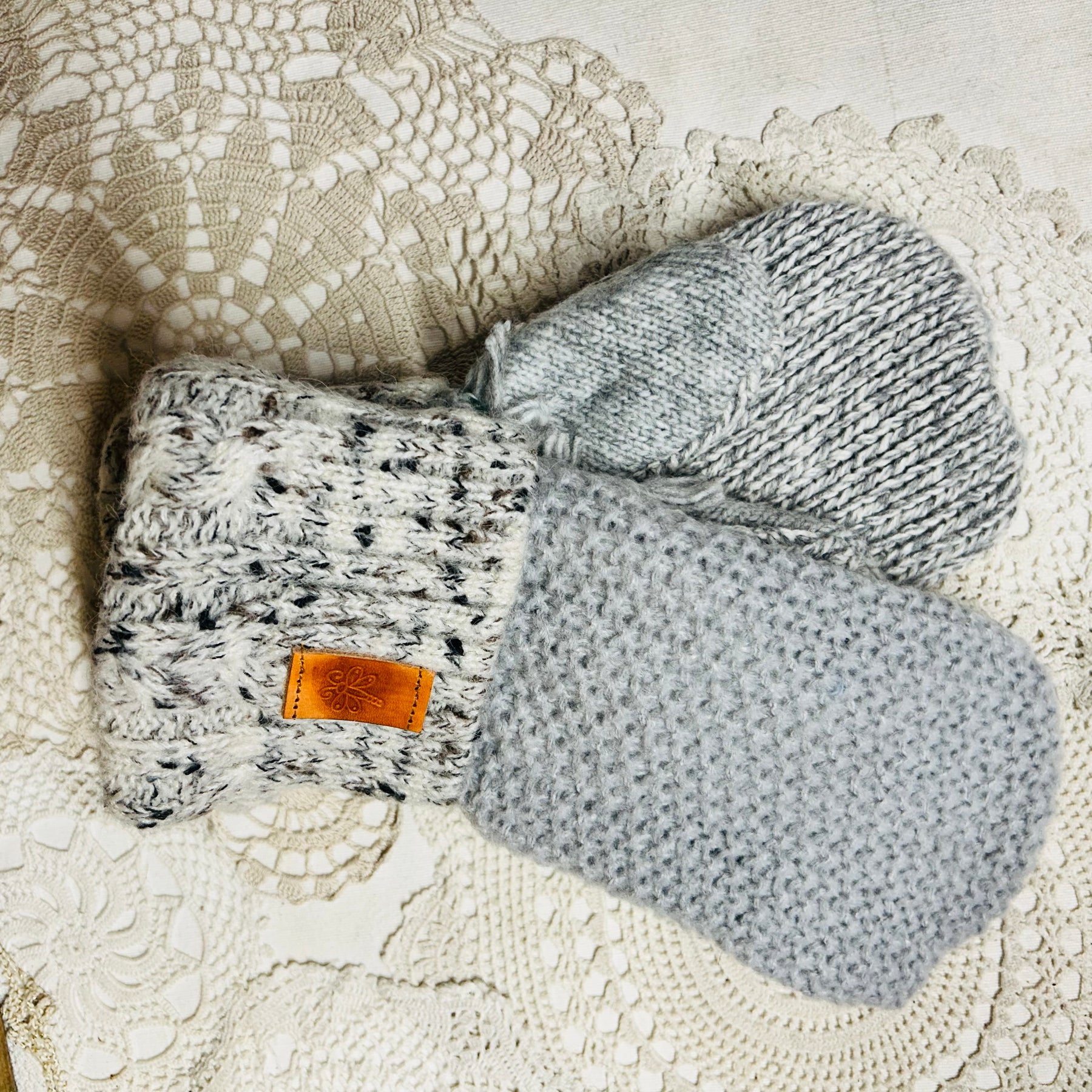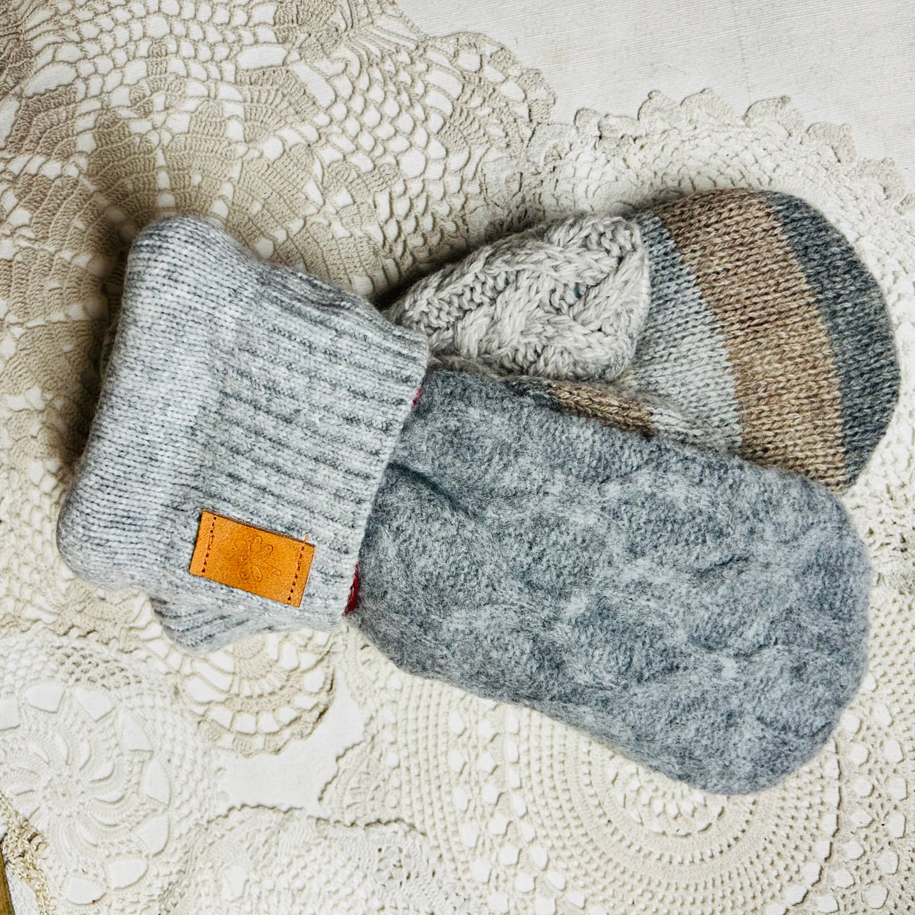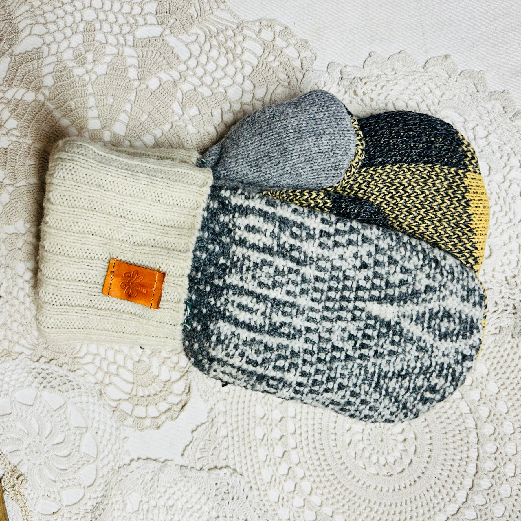 Multiple quantities of same mitt are made out of the same sweater but will vary in pattern layout and knit and fleece colours.