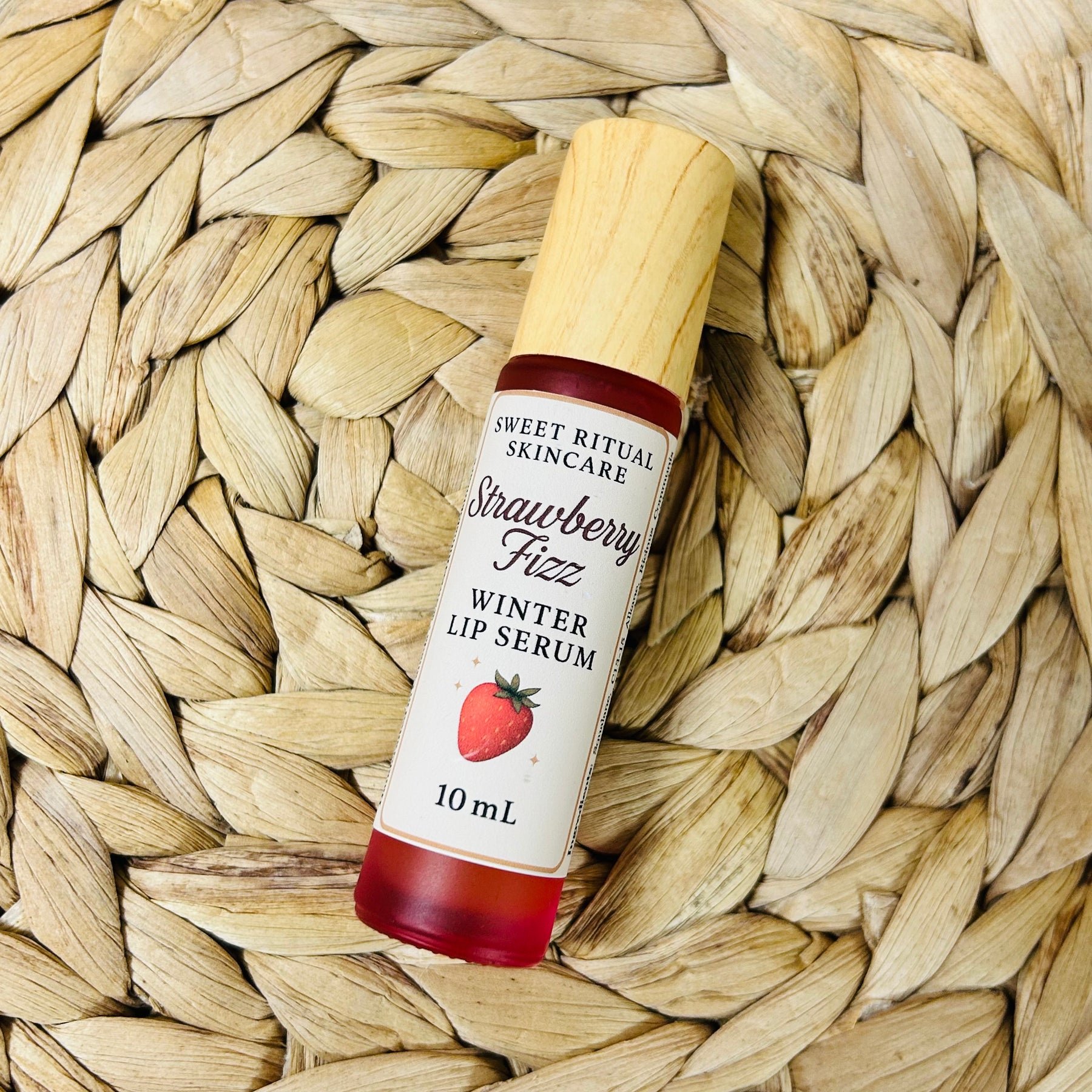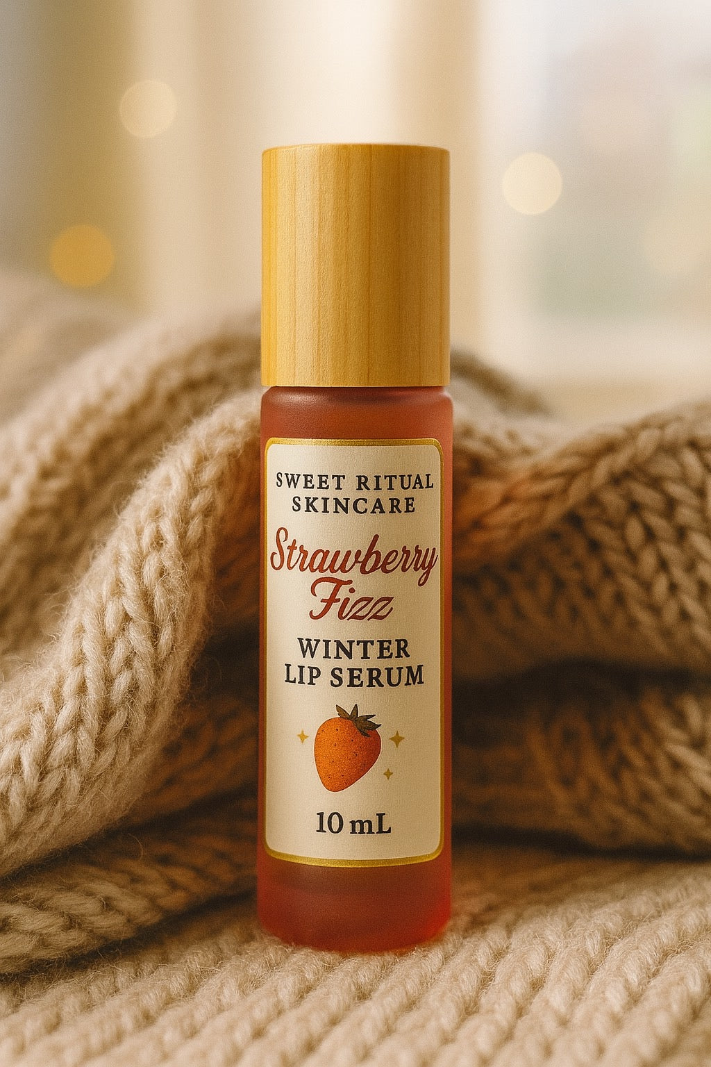 A sweet, cushiony lip treatment designed for cold-weather rescue. This glossy serum drenches lips in deep, long-lasting nourishment while softening the look of dryness and fine lip lines. A winterized blend of lanolin, cupuaçu butter, beeswax, and olive-derived squalane creates a protective cocoon without tackiness, while sea buckthorn CO₂ and vitamin E deliver antioxidant care. A whisper of stevia adds a delightful, lip-safe sweetness; the playful Strawberry Fizz flavor tastes like a strawberry soda float—creamy, sparkling, and cozy.