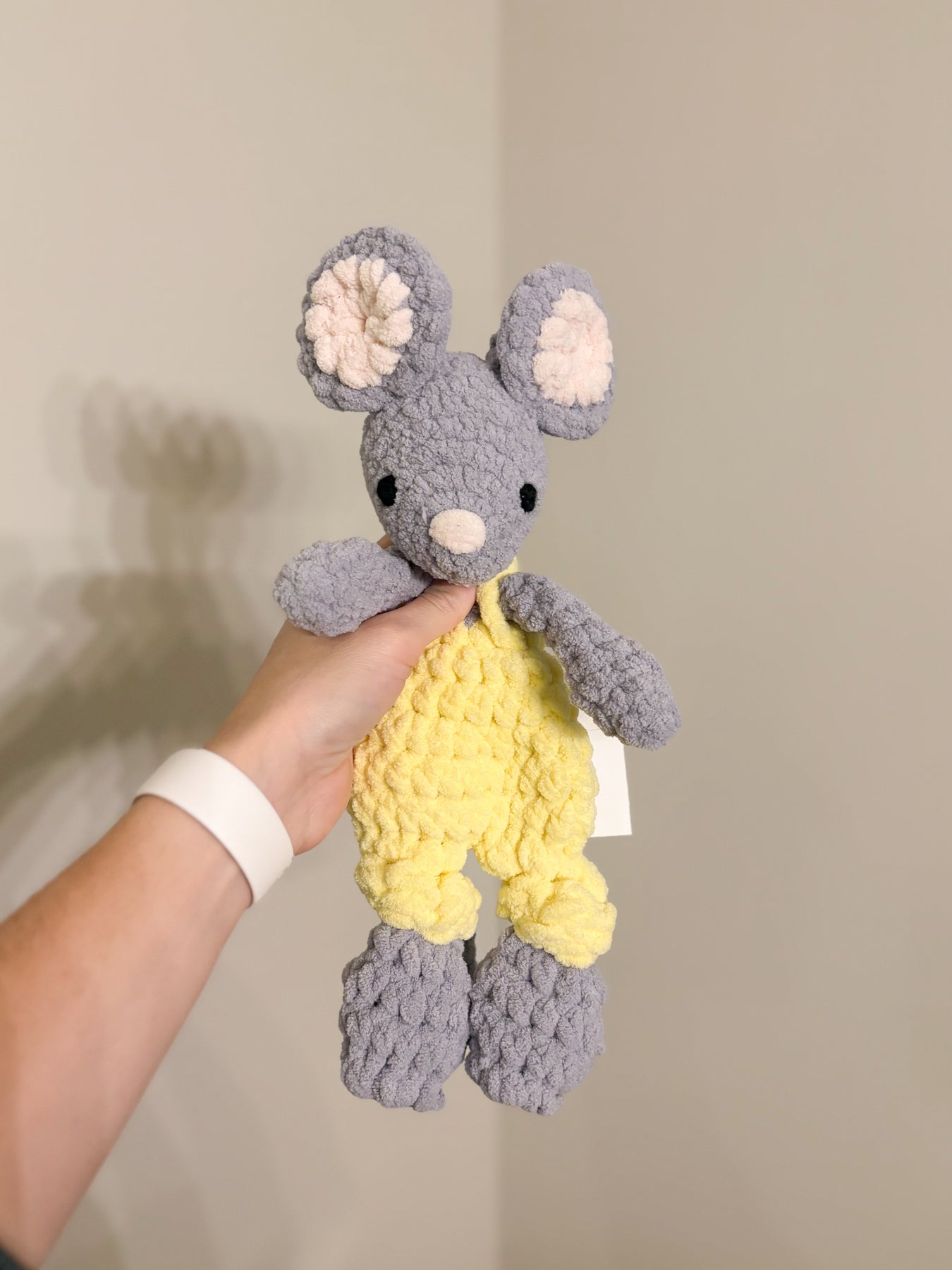 This adorable mouse lovey is a combination of a plushie, with a stuffed head, and blanket, with a soft and squishy body. It is perfect for little hands. It is made with a soft, machine-washable, chenille-like yarn, with embroidered eyes (no buttons or snaps). Perfectly paired with "If You Give a Mouse a Cookie" book series!